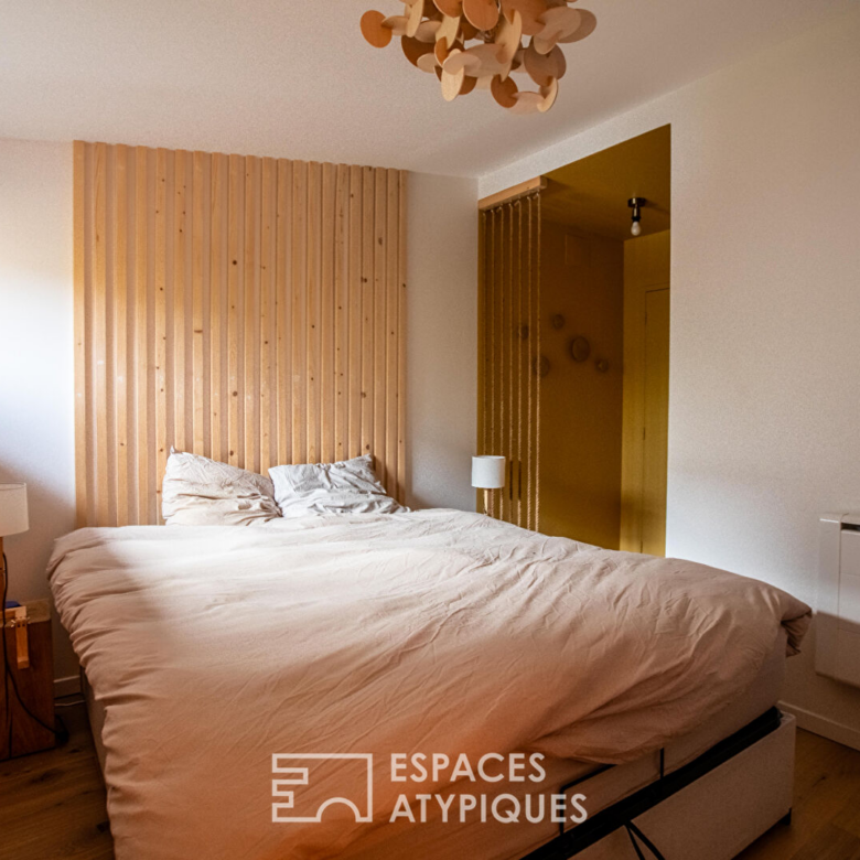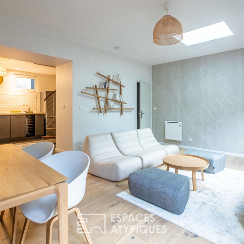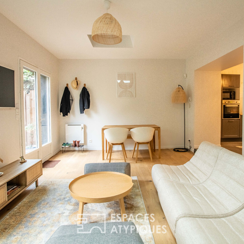 Pensé comme une maison de ville discrète, ce bien séduit dès l’entrée par ses espaces optimisés. La pièce de vie constitue le coeur de l’appartement, elle déploie une atmosphère lumineuse et apaisante, mise en scène par de larges baies vitrées ouvrant généreusement sur la terrasse et le jardin. La relation intérieur/extérieur est fluide, naturelle, invitant à vivre pleinement chaque saison.