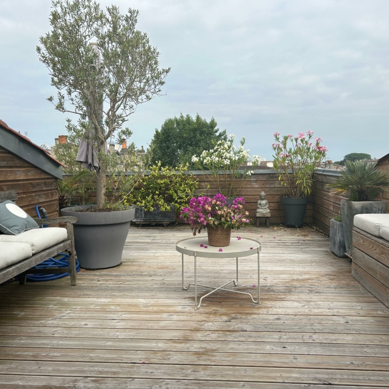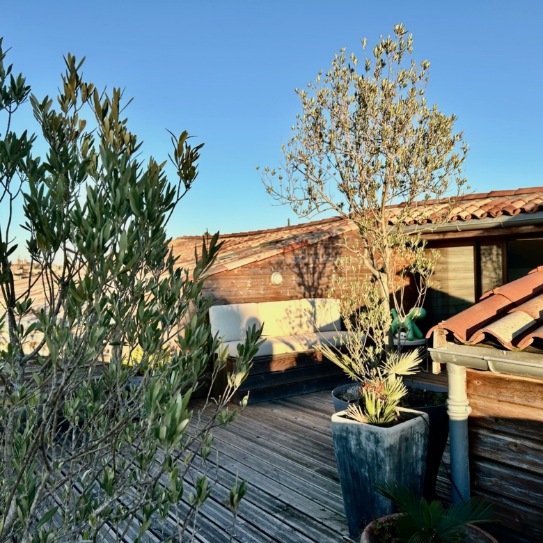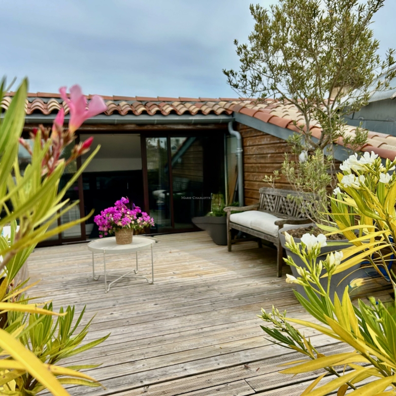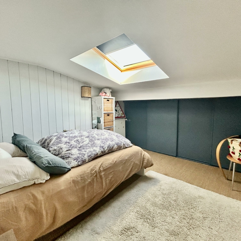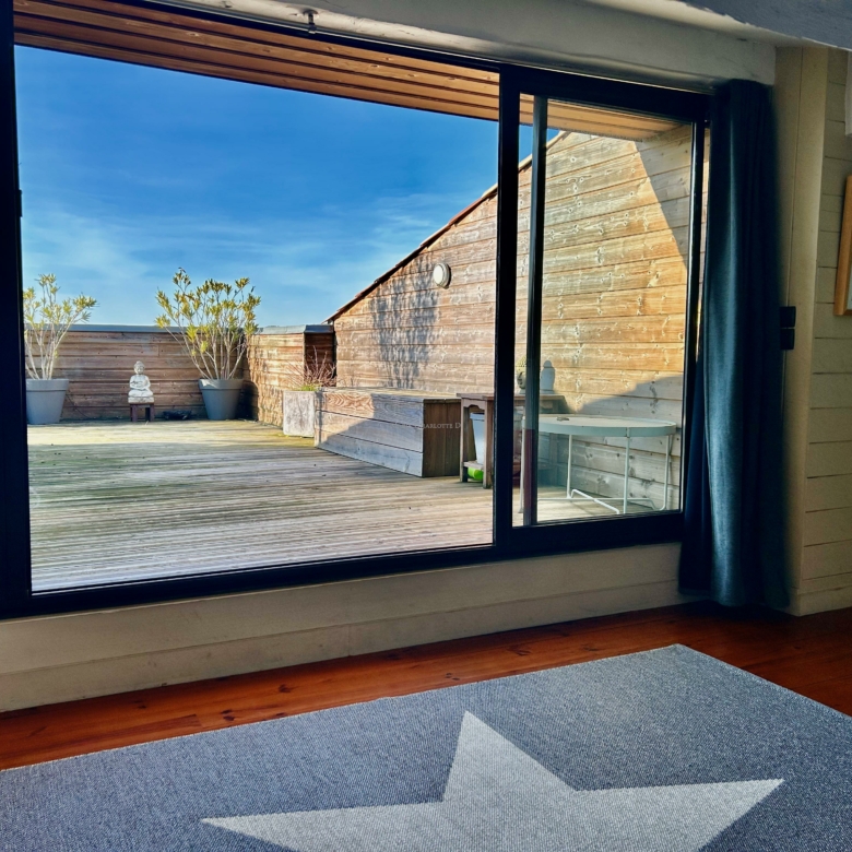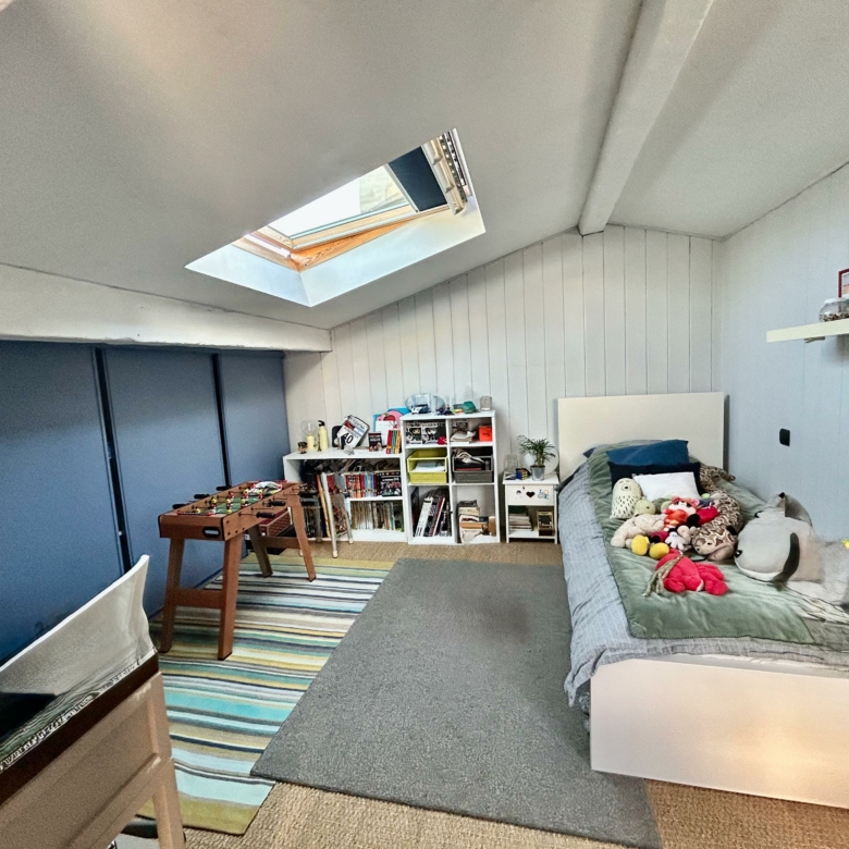À l’étage, l’appartement offre deux chambres sous pentes climatisées, une salle de bain et une salle de jeux ouverte sur une superbe terrasse plein Ouest de 40 m².