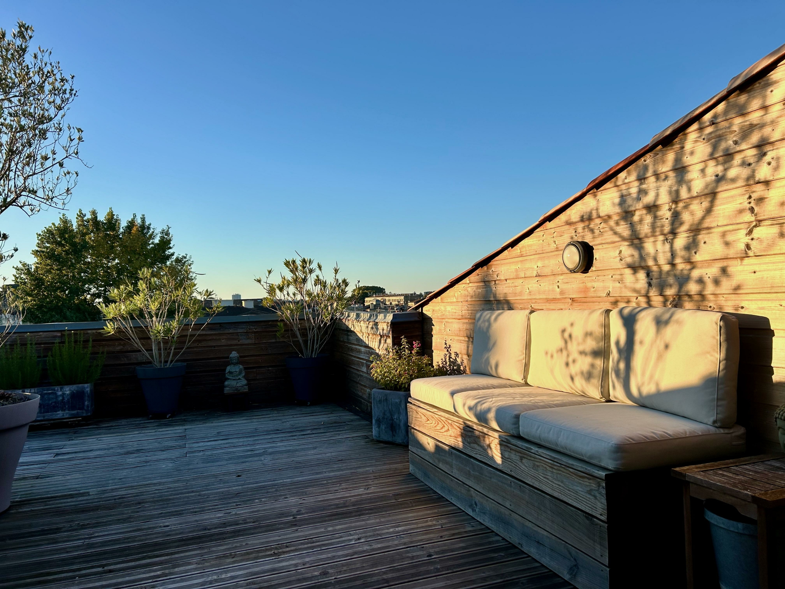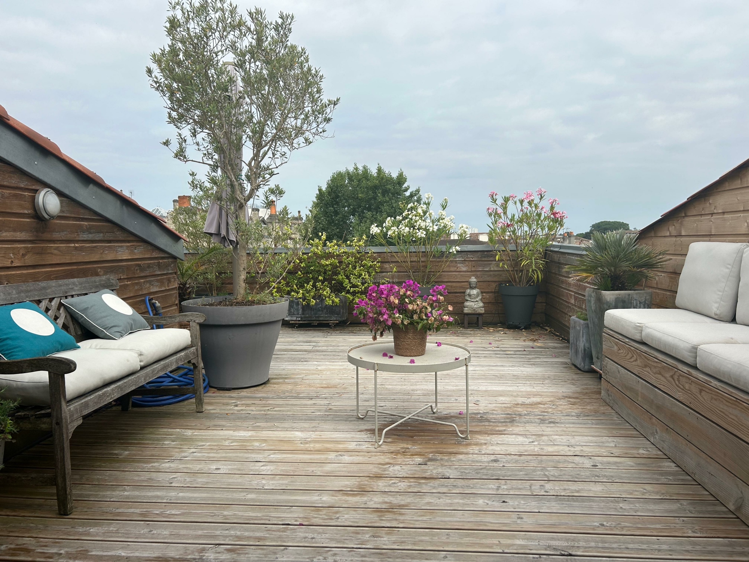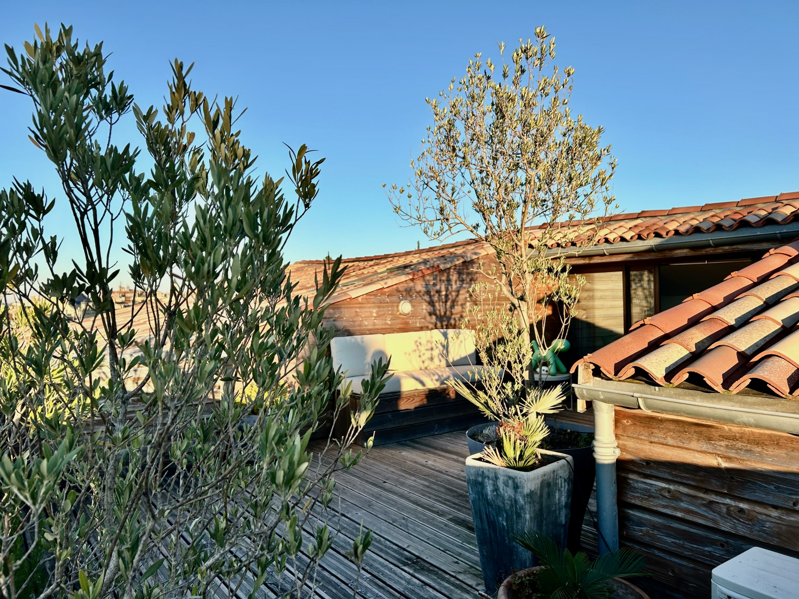 À l’étage, l’appartement offre deux chambres sous pentes climatisées, une salle de bain et une salle de jeux ouverte sur une superbe terrasse plein Ouest de 40 m².
