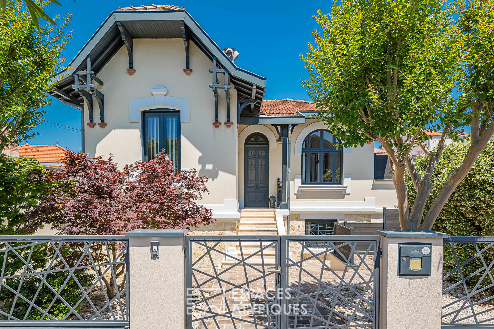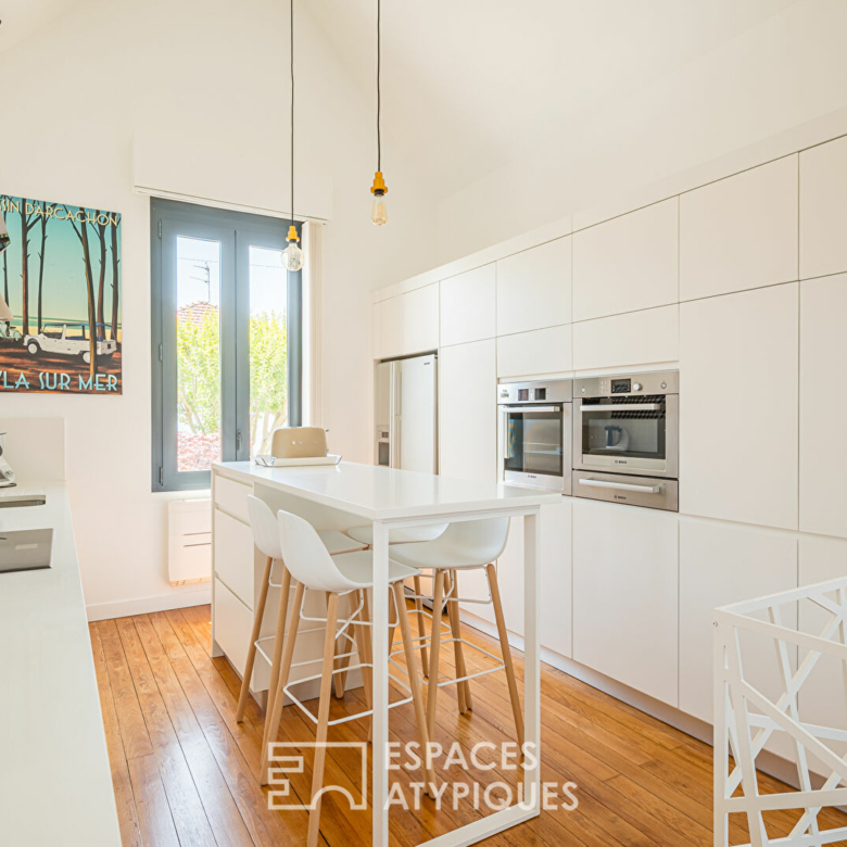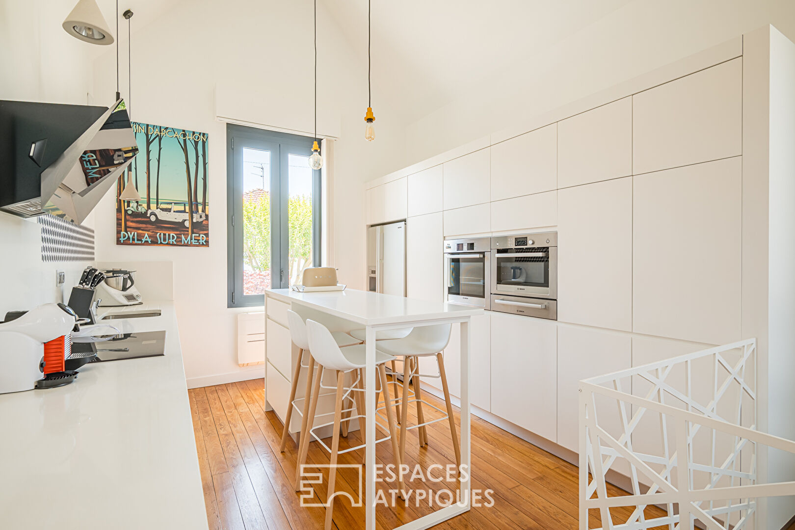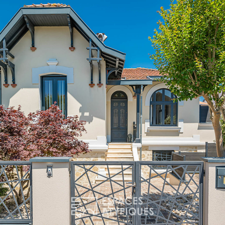 Située dans un quartier résidentiel paisible d’Arcachon, cette maison de charme des années 40 a fait l’objet d’une rénovation intégrale qui réinvente les codes de l’habitat familial avec finesse et modernité. Derrière sa façade aux lignes sobres et authentiques, cette maison développe près de 145 m² de surface habitable baignée de lumière, sur une parcelle de 320 m².