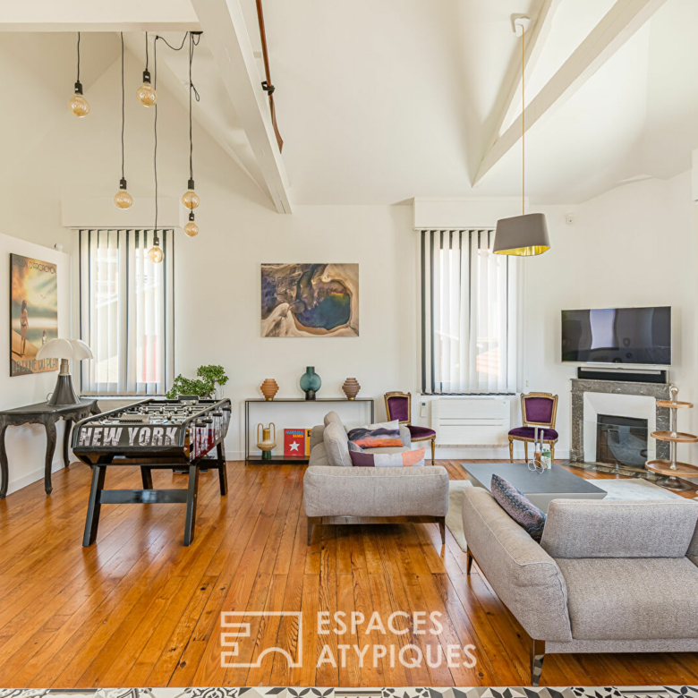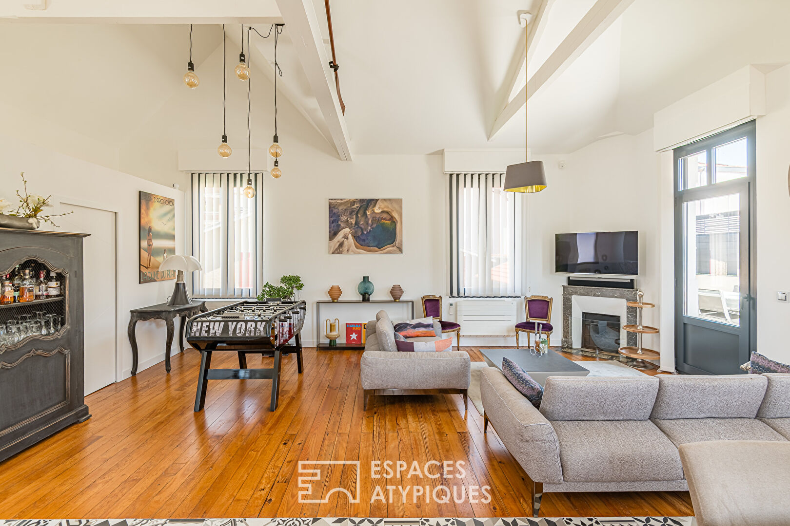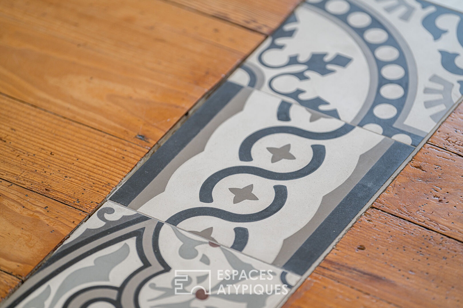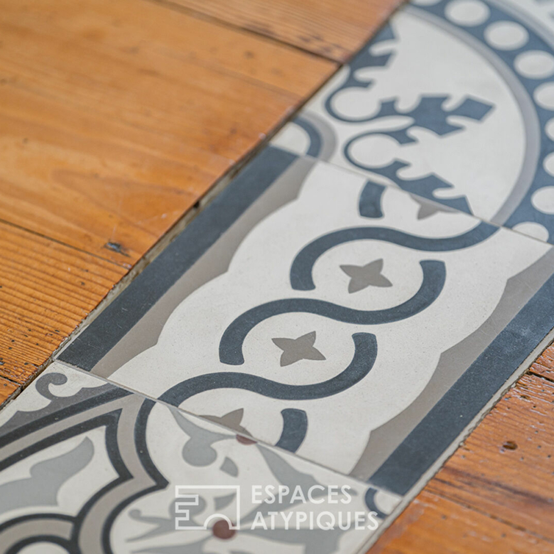 Le rez-de-chaussée accueille une vaste pièce de vie à l’ambiance chaleureuse, où l’ancien dialogue subtilement avec des lignes plus contemporaines. Parquet en bois massif, menuiseries sur mesure et belle hauteur sous plafond confèrent une âme singulière au lieu. L’espace de vie, minutieusement pensé propose un espace dinatoire tourné vers un salon confortable. La cuisine ouverte, entièrement équipée, prolonge cet espace convivial tourné vers l’extérieur où l’on découvre une terrasse ensoleillée. Un WC complète ce niveau.