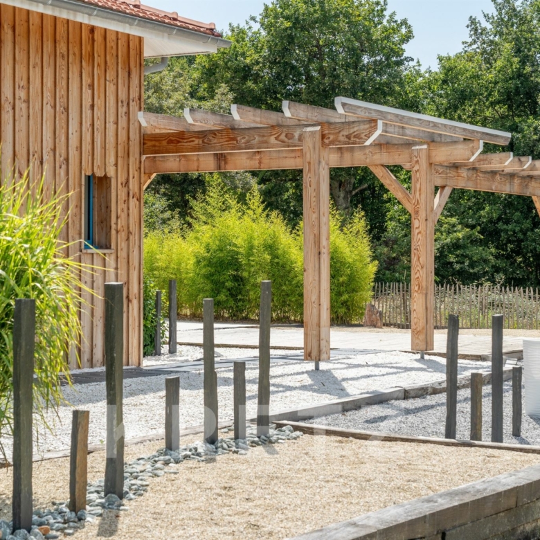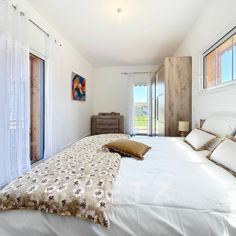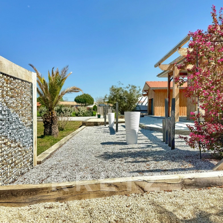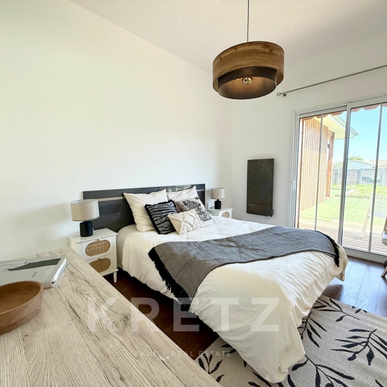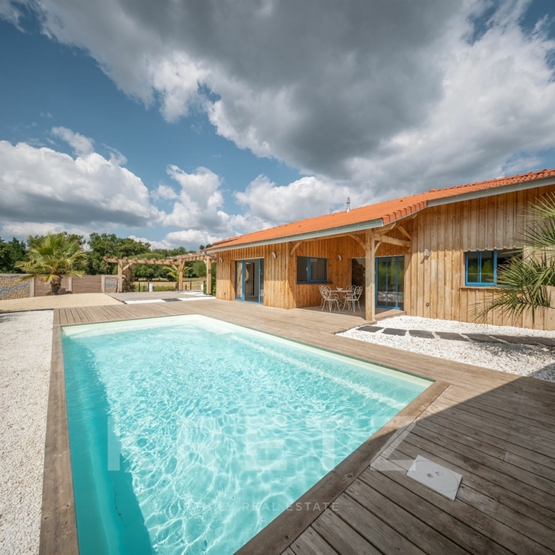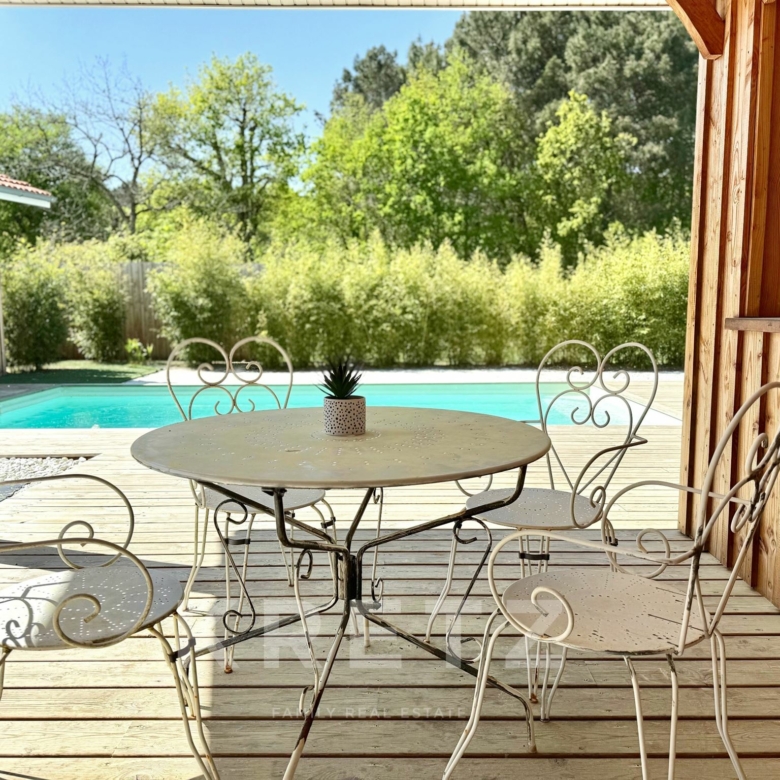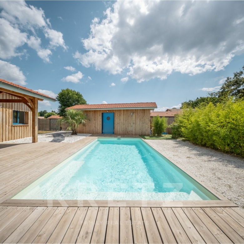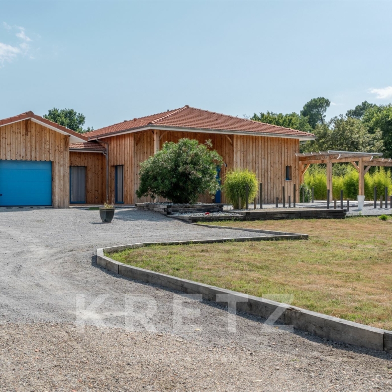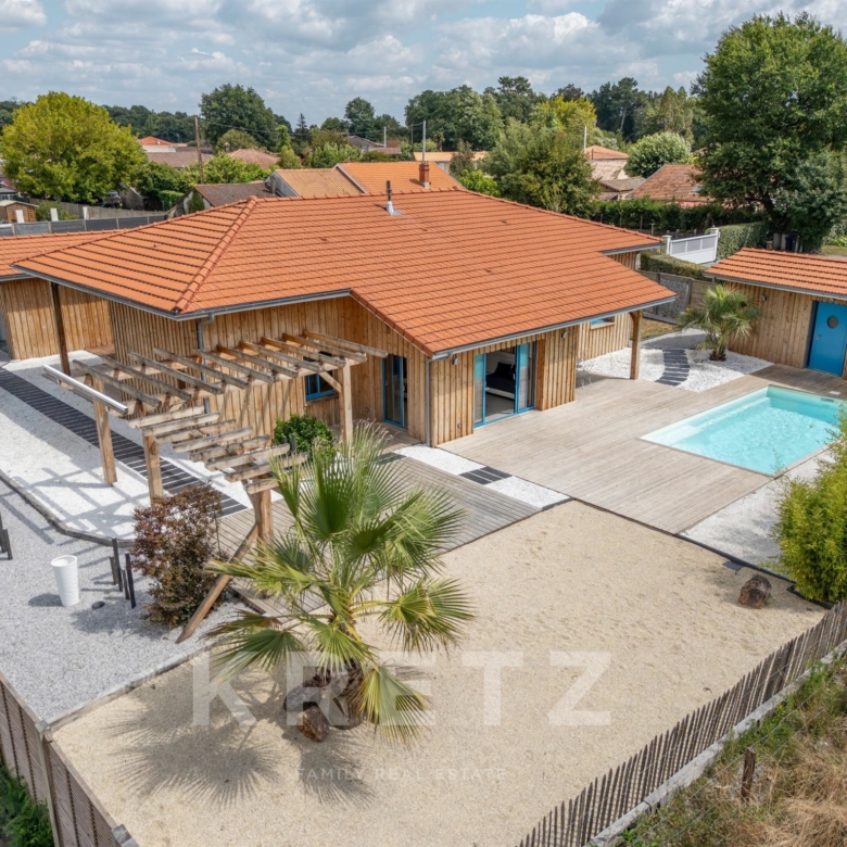 EXCLUSIVITÉ – Biganos, route d’Audenge, quartier Tagon / Vigneau À deux pas du centre-ville, au cœur d’un écrin de verdure de 4 000 m² au calme absolu, se niche cette villa d’architecte de plain-pied d’environ 200 m², signée Atelier Ballion + Poisson (2021), à l’esprit cabane chic du Cap Ferret contemporain. Classée aux normes A-A avec la validation de pose de panneaux solaires, elle deviendra entièrement autonome en énergie. Une vaste pièce de vie de 72 m², baignée de lumière, avec 3,40 m de hauteur sous plafond et poêles à granulés haut de gamme, s’ouvre sur les terrasses et la piscine. Dans son prolongement, une cuisine ouverte de 22 m² conviviale, complétée par un cellier fonctionnel. L’espace nuit offre 3 chambres, chacune avec salle d’eau privative et accès direct aux terrasses, pour une vraie vie dedans-dehors. Le jardin paysagé dessine une atmosphère de bord de mer : plage de sable, palmiers, bambous, larges terrasses bois et piscine chauffée au centre de la vie extérieure, accessible depuis toutes les pièces de vie. Dépendance : 20m², chambre supplémentaire ou studio (DP acceptée mairie). Carport pour 2 véhicules et nombreux stationnements sur la parcelle. Abri technique de 18 m². Reste droit à construire 70m² environ avec possibilité d’étendre la propriété jusqu’à 7 000 m² grâce aux parcelles attenantes. Gare TGV (liaisons directes Paris – Arcachon) à 2 min. Commerces et écoles du centre-ville de Biganos à 2 min. Port de Biganos à 8 min. Bassin d’Arcachon à 25 min, Cap Ferret à 35 min. Une adresse rare pour ceux qui veulent retrouver l’esprit du Cap Ferret dans un cadre préservé, tout en restant connectés à toutes les commodités.