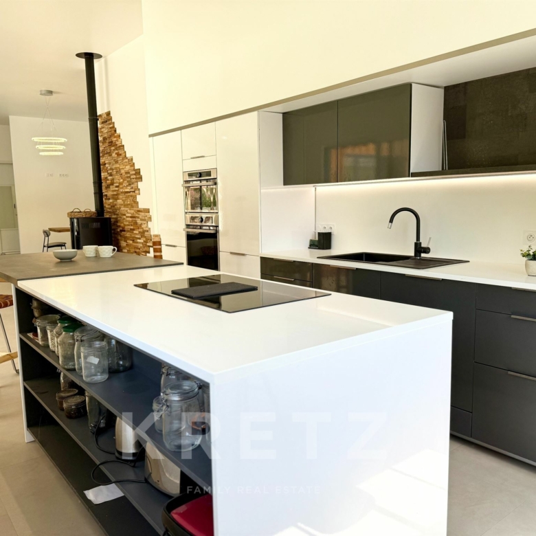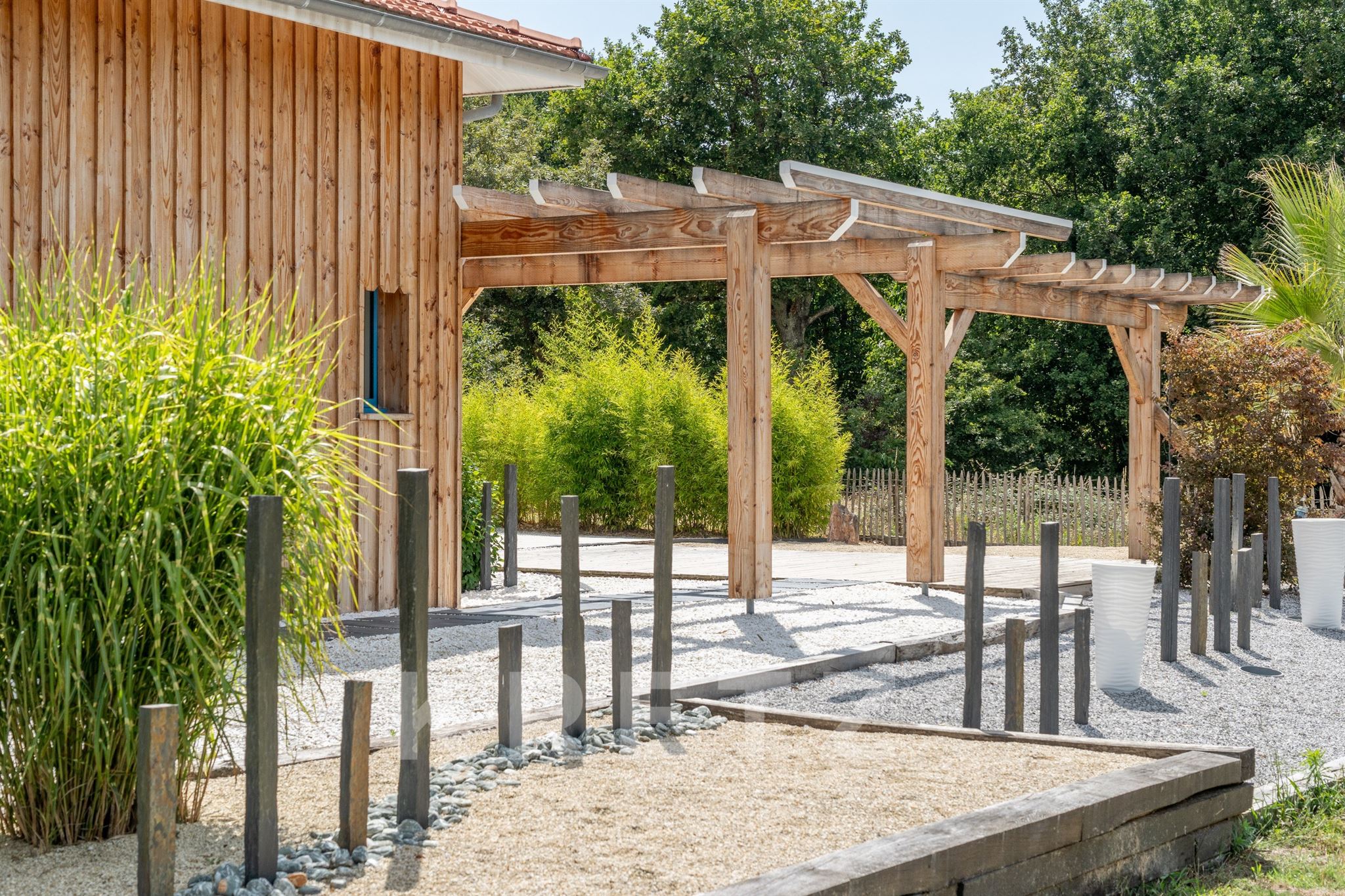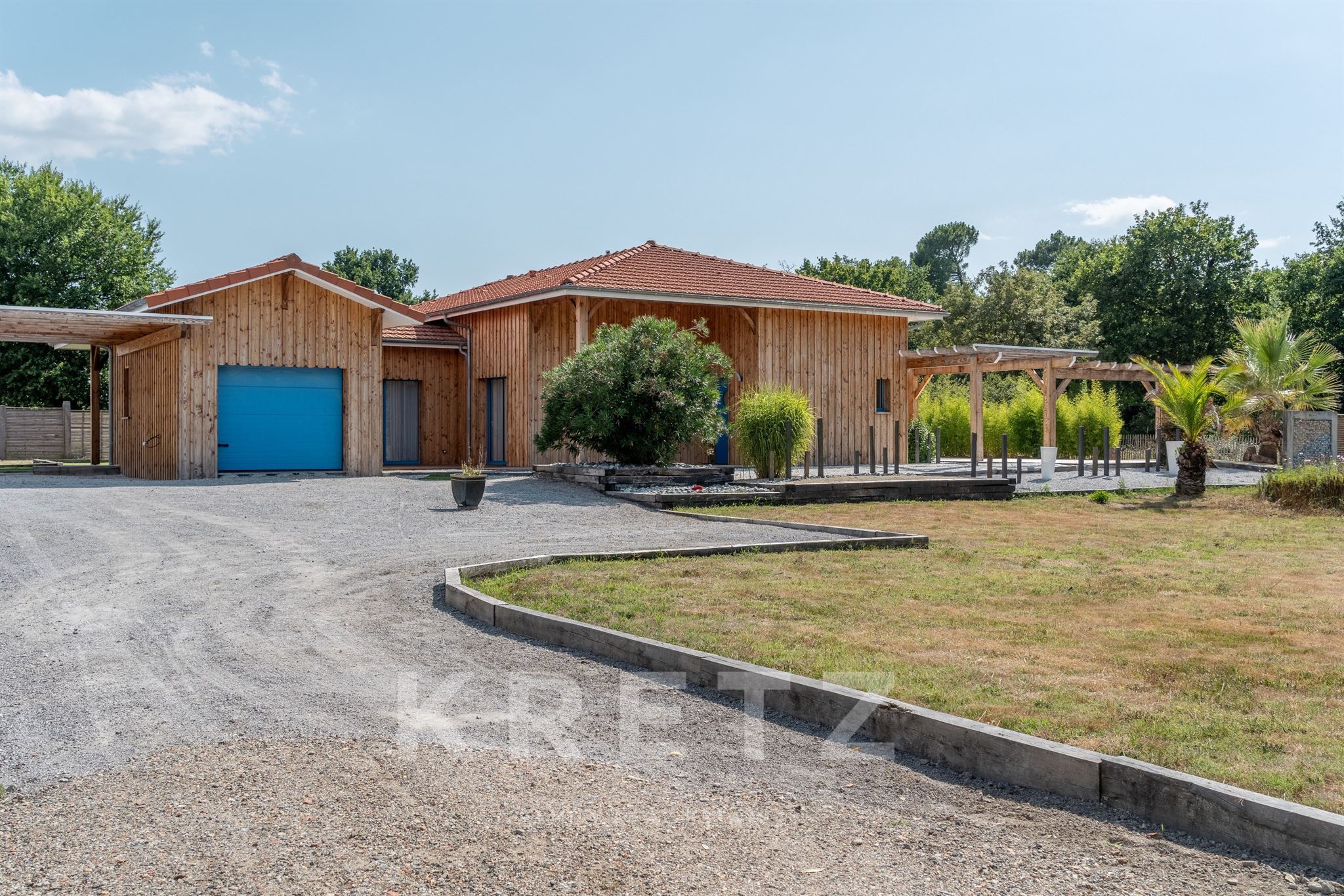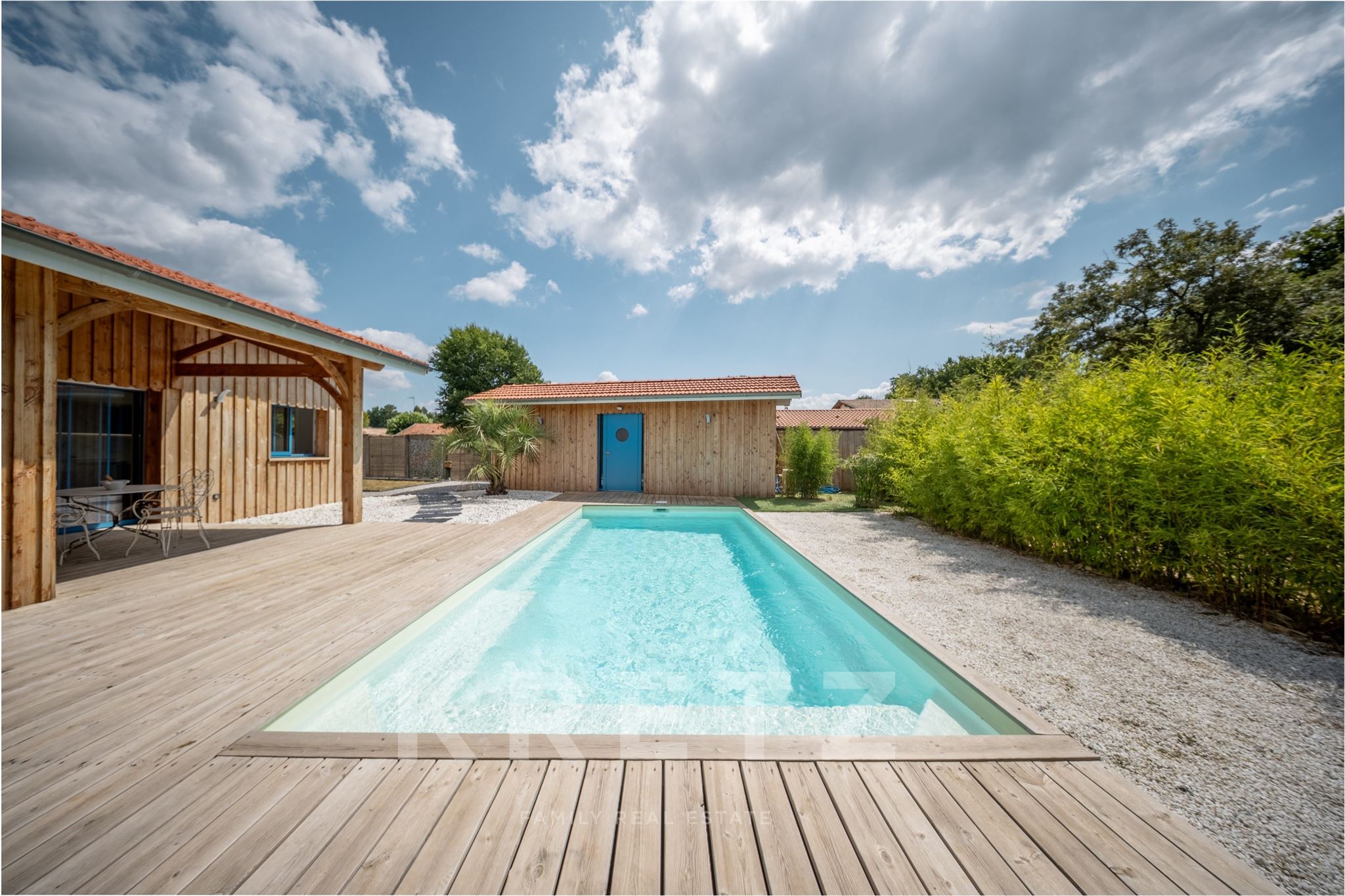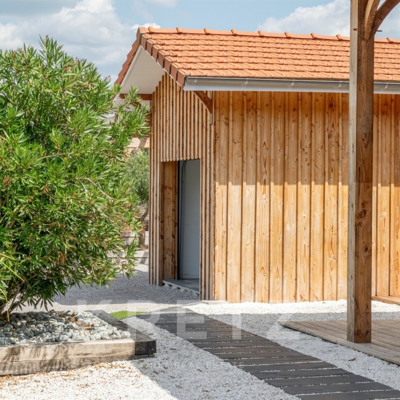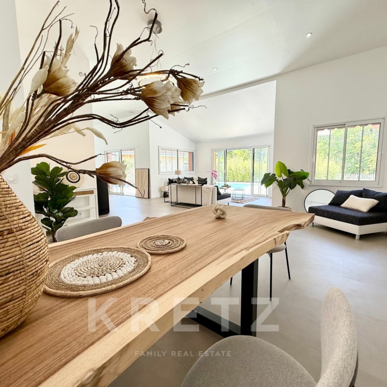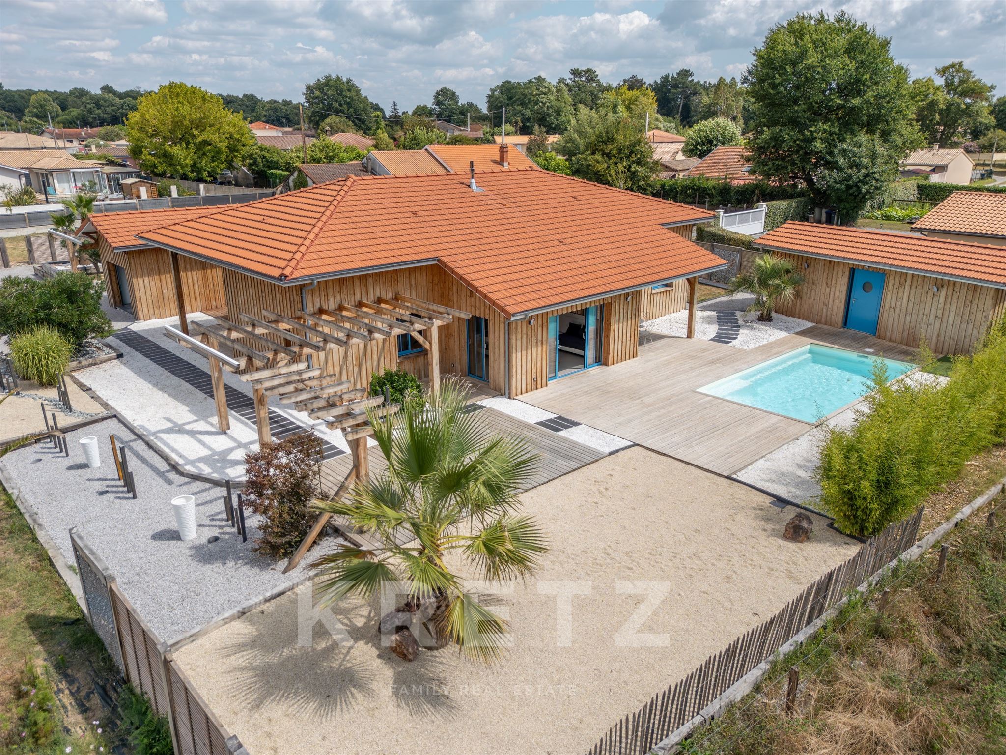 EXCLUSIVITÉ – Biganos, route d’Audenge, quartier Tagon / Vigneau À deux pas du centre-ville, au cœur d’un écrin de verdure de 4 000 m² au calme absolu, se niche cette villa d’architecte de plain-pied d’environ 200 m², signée Atelier Ballion + Poisson (2021), à l’esprit cabane chic du Cap Ferret contemporain. Classée aux normes A-A avec la validation de pose de panneaux solaires, elle deviendra entièrement autonome en énergie. Une vaste pièce de vie de 72 m², baignée de lumière, avec 3,40 m de hauteur sous plafond et poêles à granulés haut de gamme, s’ouvre sur les terrasses et la piscine. Dans son prolongement, une cuisine ouverte de 22 m² conviviale, complétée par un cellier fonctionnel. L’espace nuit offre 3 chambres, chacune avec salle d’eau privative et accès direct aux terrasses, pour une vraie vie dedans-dehors. Le jardin paysagé dessine une atmosphère de bord de mer : plage de sable, palmiers, bambous, larges terrasses bois et piscine chauffée au centre de la vie extérieure, accessible depuis toutes les pièces de vie. Dépendance : 20m², chambre supplémentaire ou studio (DP acceptée mairie). Carport pour 2 véhicules et nombreux stationnements sur la parcelle. Abri technique de 18 m². Reste droit à construire 70m² environ avec possibilité d’étendre la propriété jusqu’à 7 000 m² grâce aux parcelles attenantes. Gare TGV (liaisons directes Paris – Arcachon) à 2 min. Commerces et écoles du centre-ville de Biganos à 2 min. Port de Biganos à 8 min. Bassin d’Arcachon à 25 min, Cap Ferret à 35 min. Une adresse rare pour ceux qui veulent retrouver l’esprit du Cap Ferret dans un cadre préservé, tout en restant connectés à toutes les commodités.