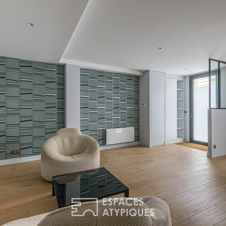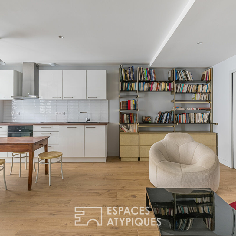 Bénéficiant d’une entrée privative et indépendante, cet appartement est composé d’une spacieuse pièce de vie avec cuisine ouverte et équipée. Issu d’une rénovation récente, de grandes ouvertures permettent à la luminosité de s’inviter, créant une atmosphère chaleureuse.