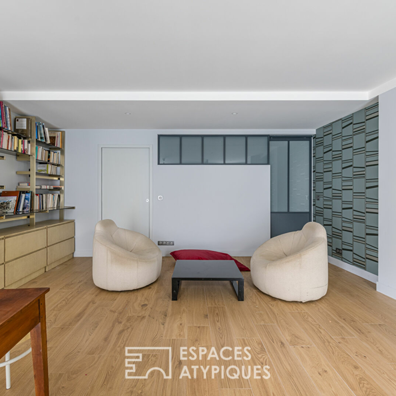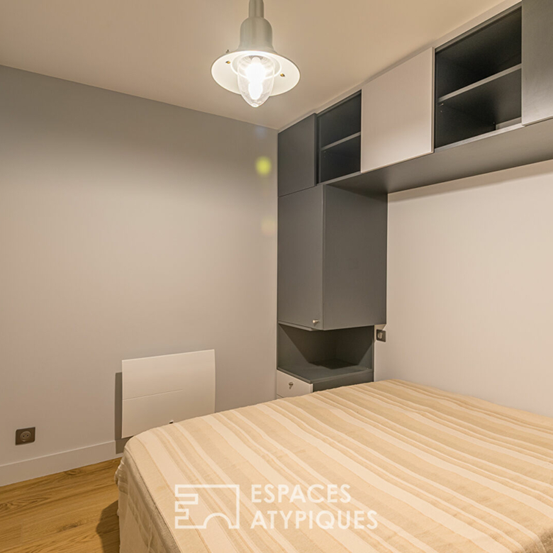 Une chambre en second jour, séparée par une verrière type atelier, accueil un espace nuit cocooning.