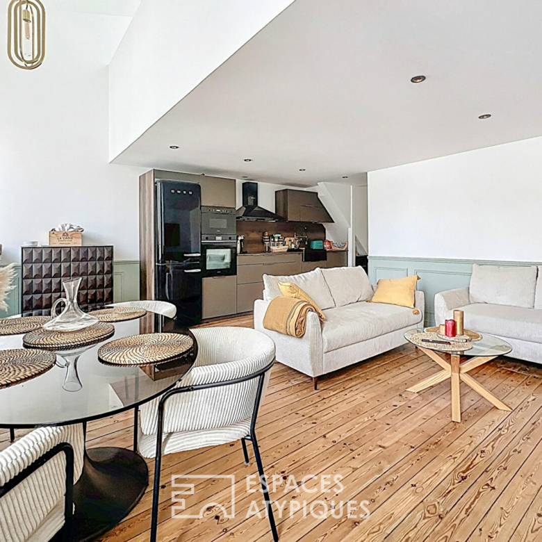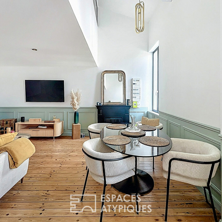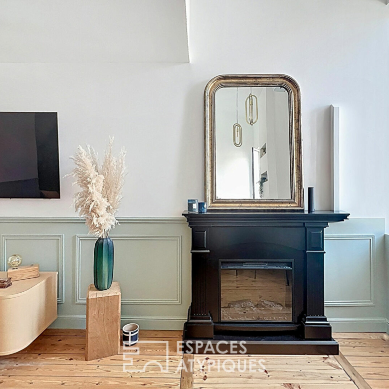 Situé proche de l’église St Martial aux Chartrons, cet appartement niché au premier et dernier étage de 80m², installé dans une petite copropriété rénovée, déploie un cachet unique et une atmosphère chaleureuse.