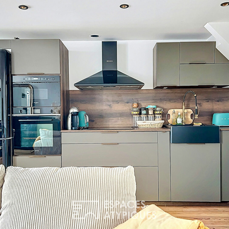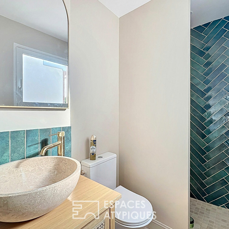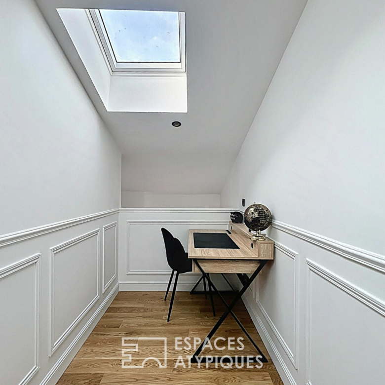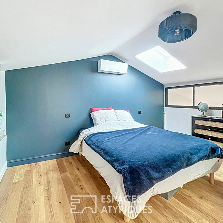 A l’étage, un coin bureau-espace de travail, une suite parentale avec rangements sur-mesure et salle d’eau privative ainsi qu’un espace grenier/rangements minutieusement pensé.