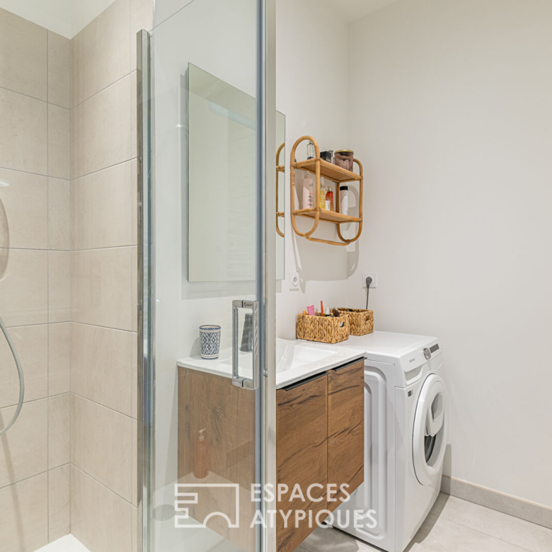 À l’étage, le palier dessert une agréable terrasse de 16 m², sans aucun vis-à-vis, véritable prolongement extérieur de l’appartement. On y découvre également un salon télé aménagé sous les combles, une seconde chambre avec dressing attenant et un espace supplémentaire sous pente dédié au rangement.