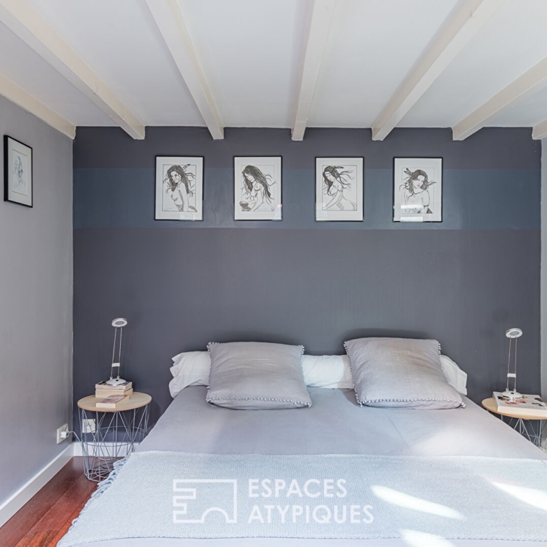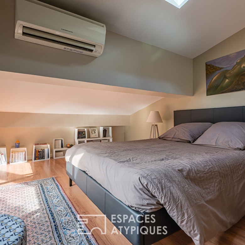 L’étage accueille une mezzanine ouverte, idéale pour un bureau ou un espace détente, ainsi qu’une seconde chambre sous combles avec sa propre salle de bains.