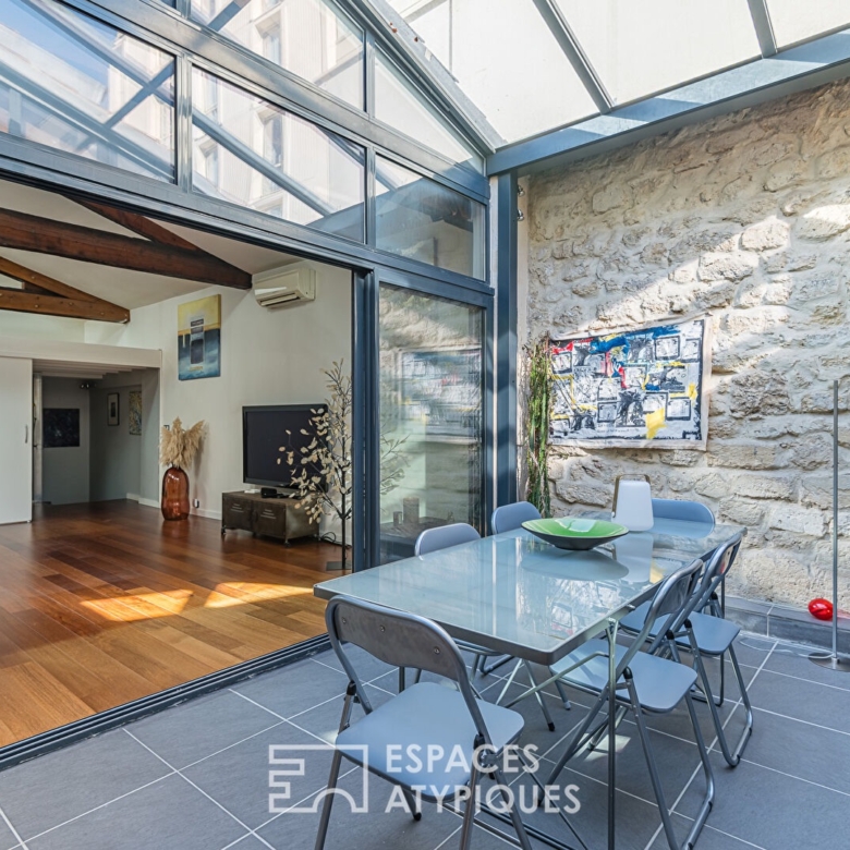 Dans une rue calme, entre la MÉCA et la place Ferdinand Buisson, ce vaste loft lumineux s’inscrit au sein d’une copropriété issue de la réhabilitation d’anciens entrepôts réalisée il y a une vingtaine d’années.