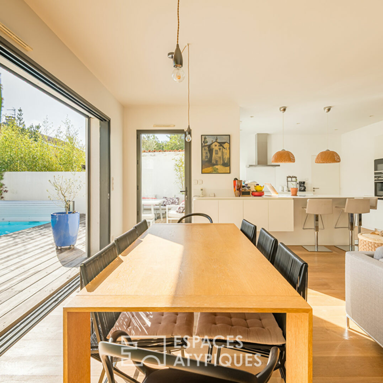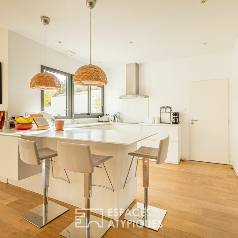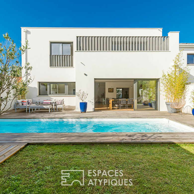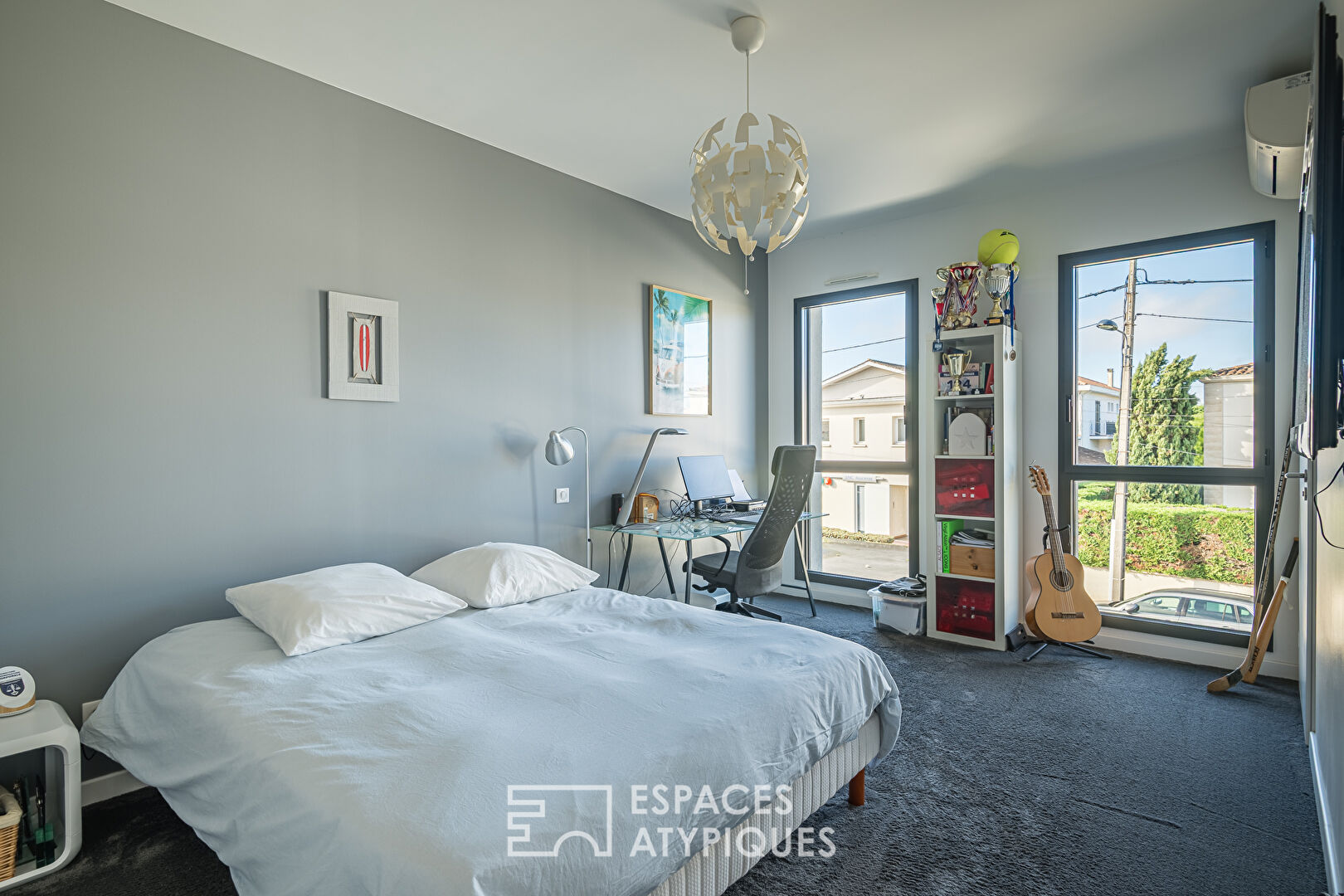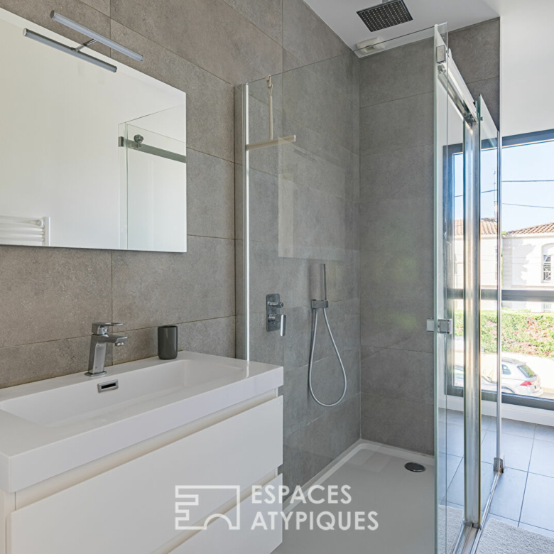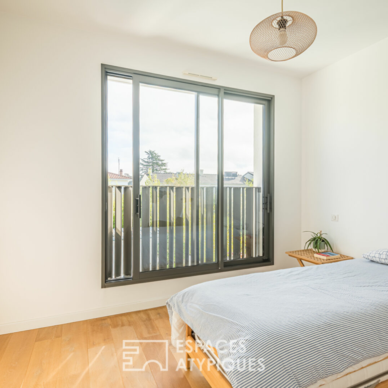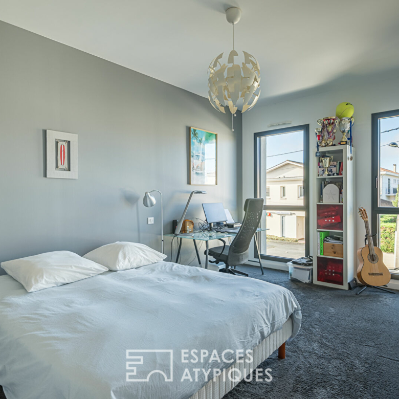 Édifiée en 2018, cette maison d’architecte contemporaine séduit par ses volumes lumineux, ses prestations haut de gamme et son environnement calme et recherché, à proximité immédiate des commodités du centre de Caudéran.