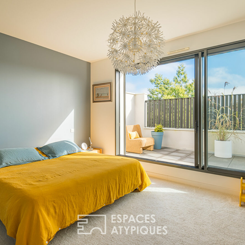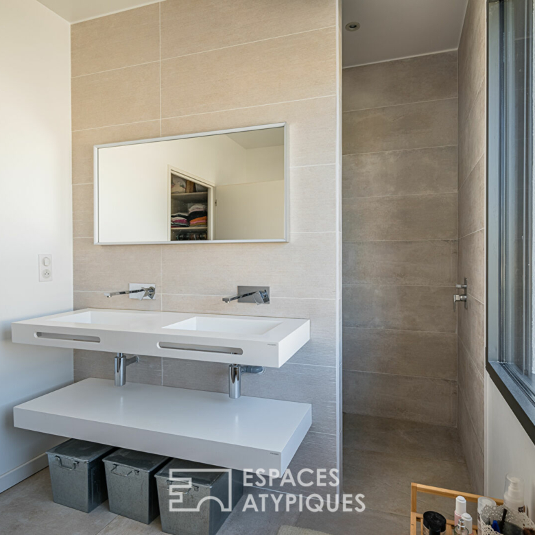 Sur l’avant de la parcelle, un espace de stationnement aérien, protégé par un portail électrique, parachève cette maison d’architecte où esthétisme, confort et fonctionnalité se conjuguent avec équilibre.