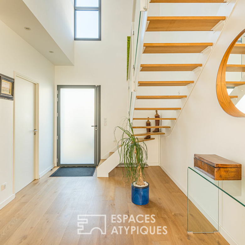 Dès l’entrée, la hauteur sous plafond et les lignes épurées annoncent le ton : un lieu à la fois élégant et convivial. L’entrée, agrémentée de rangements, s’accompagne d’un WC indépendant.