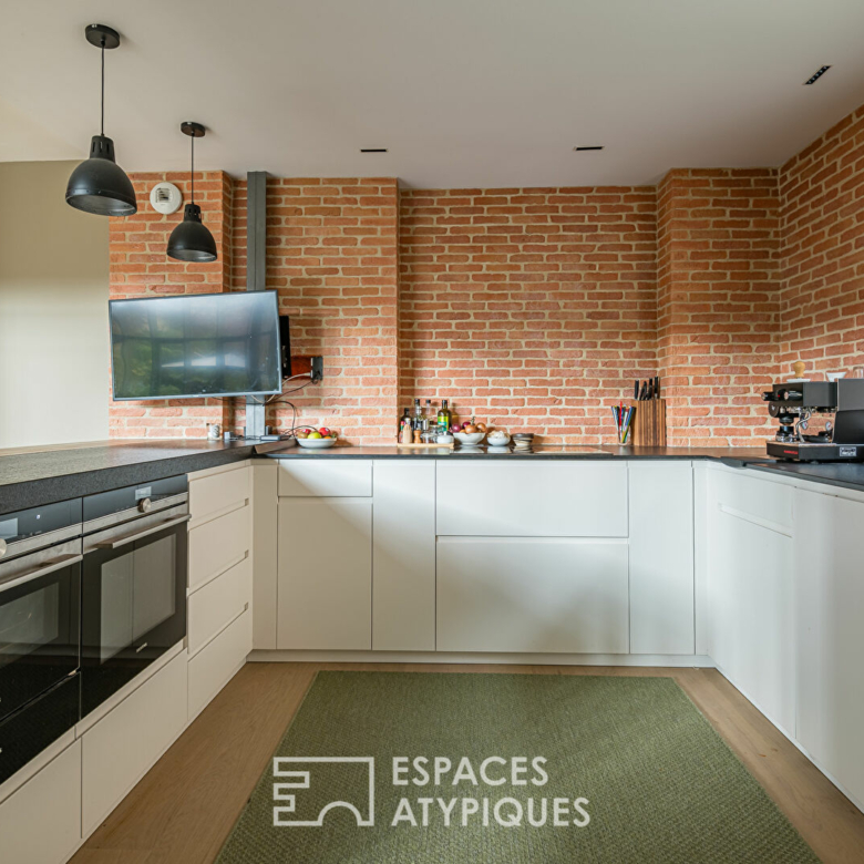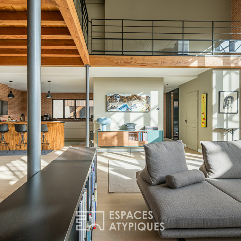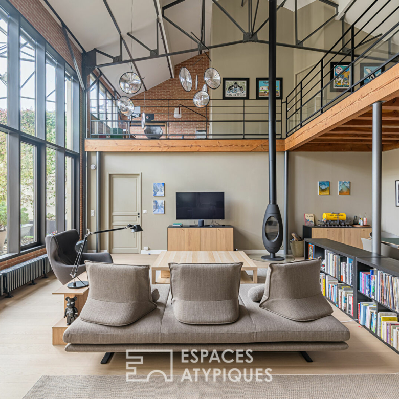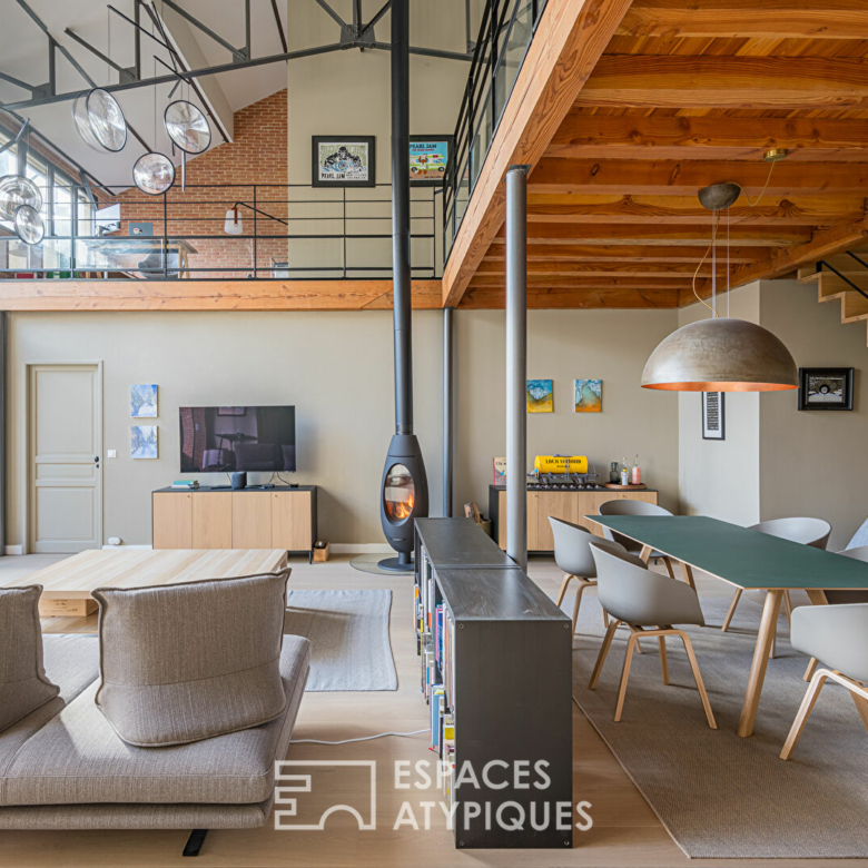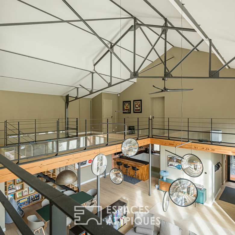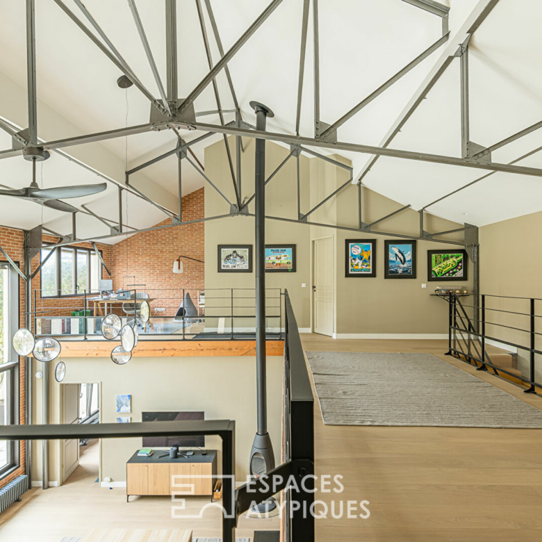 À l’étage, on découvre une belle mezzanine ouverte avec un vide sur séjour. Un espace bureau a été aménagé, offrant une vue plongeante sur les volumes impressionnants du rez-de-chaussée.