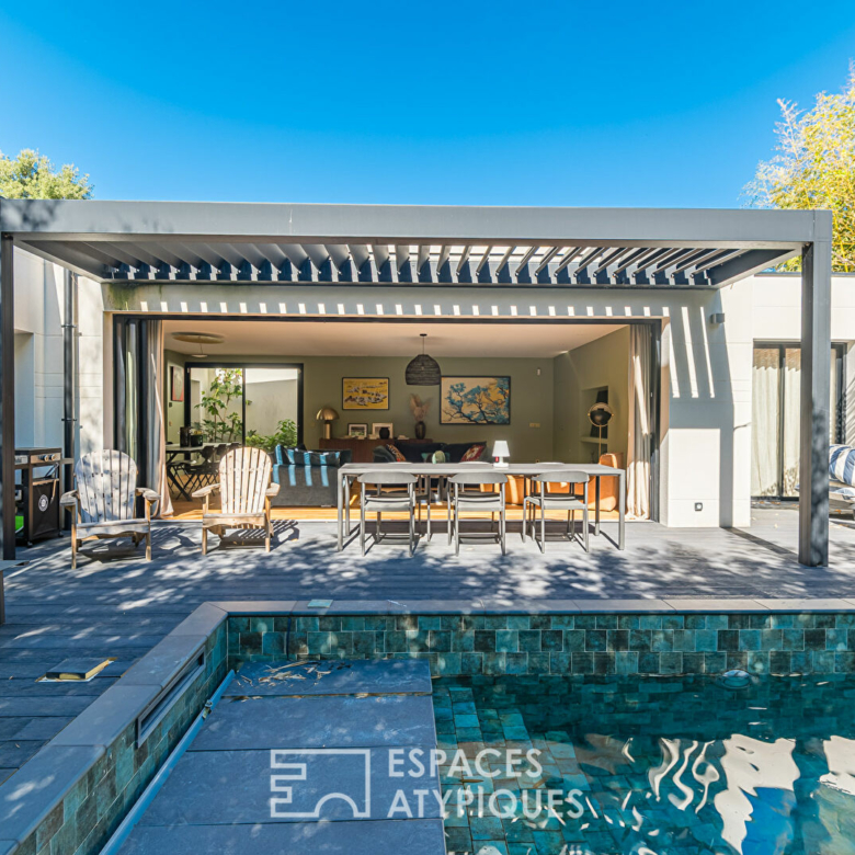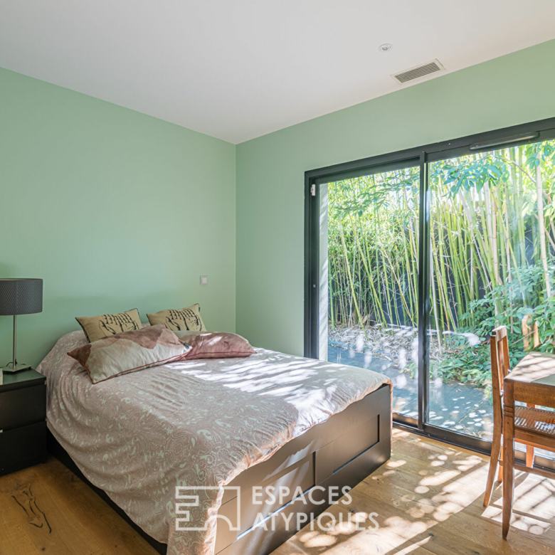 Située au coeur de Talence, dans un environnement calme et privilégié en seconde ligne, cette maison contemporaine d’environ 190 m², implantée sur une parcelle de 600 m², est une véritable invitation à la sérénité. Son architecture élégante, en parfaite harmonie avec la végétation environnante, offre un cadre de vie à la fois fonctionnel, lumineux et chaleureux.