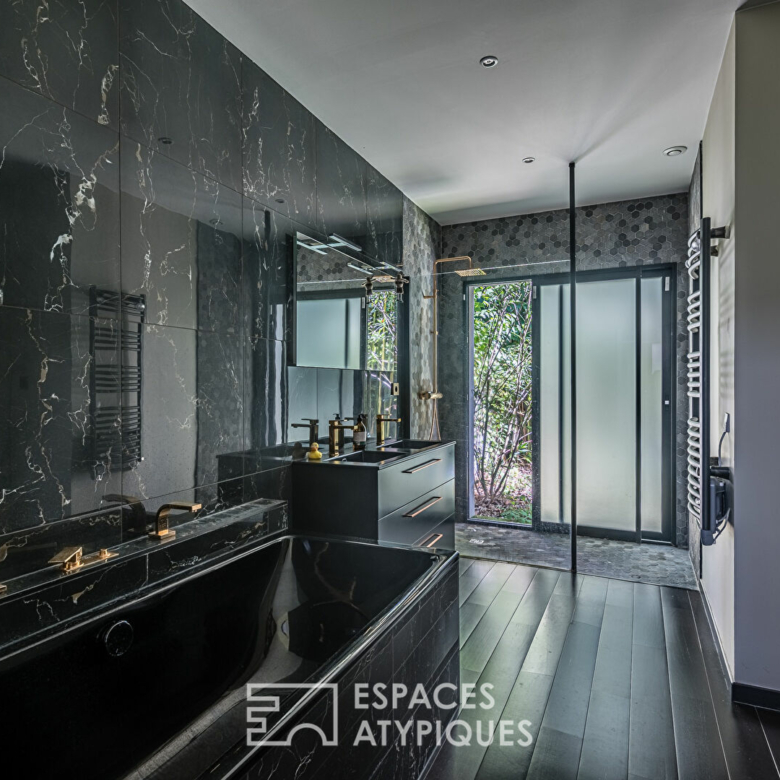 À l’abri des regards depuis la rue, on accède à la propriété par un large garage de plus de 60 m². L’entrée, dotée de nombreux rangements, s’ouvre sur une spacieuse pièce de vie baignée de lumière grâce à son exposition plein sud. La cuisine ouverte, entièrement aménagée et équipée, se fond naturellement dans l’espace avec son îlot central et sa grande baie vitrée à galandage donnant sur le jardin paysagé et la piscine. La partie nuit se compose de quatre chambres, chacune avec salle d’eau privative et rangements intégrés. Une suite parentale complète l’ensemble avec un grand dressing et une salle de bain équipée d’une baignoire et d’une douche.