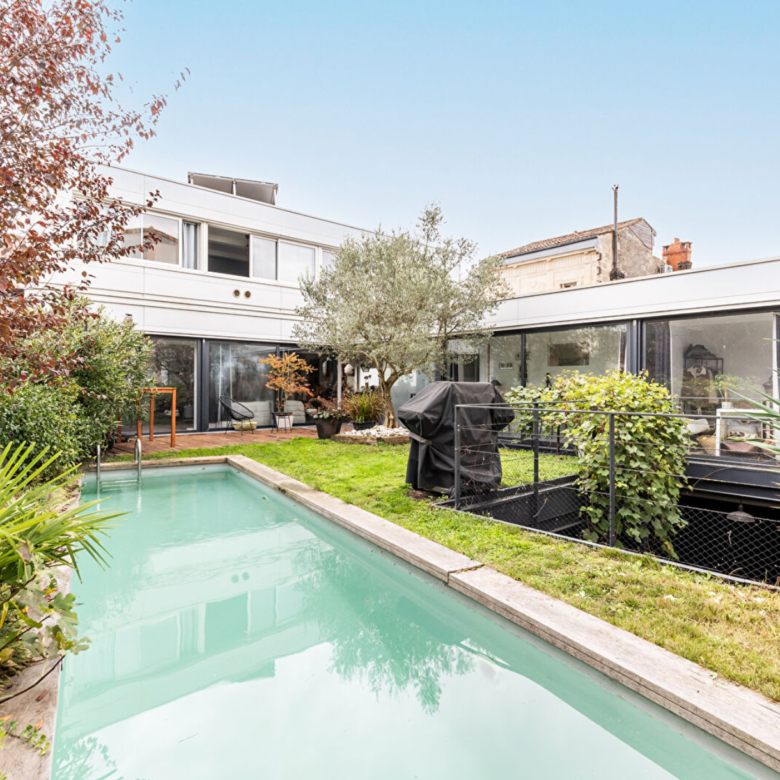 Située à deux pas du Jardin Public et des Chartrons, proche des commodités et écoles de renom, superbe maison d’architecte esprit loft d’environ 170 m2 avec terrasse, jardin suspendu (100m2), piscine 9×2, bureau (environ 27 m2), T2 indépendant (environ 60 m2), garage.