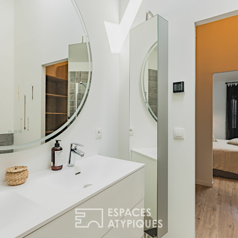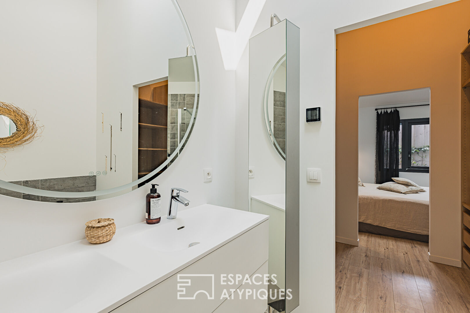 Dès l’entrée, une vaste pièce de vie s’offre à vous, baignée de lumière grâce à deux grands velux. Le salon, aux volumes généreux, s’ouvre sur une cuisine équipée ouverte, idéale pour recevoir. Les matériaux soigneusement sélectionnés et les rangements intégrés apportent confort et esthétisme.