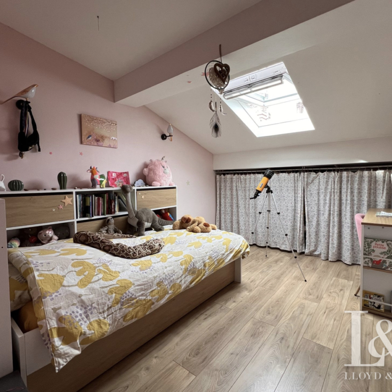 À l’étage, un couloir dessert une chambre parentale élégante, deux chambres sous combles pleines de caractère et une spacieuse salle de bain avec baignoire et douche.