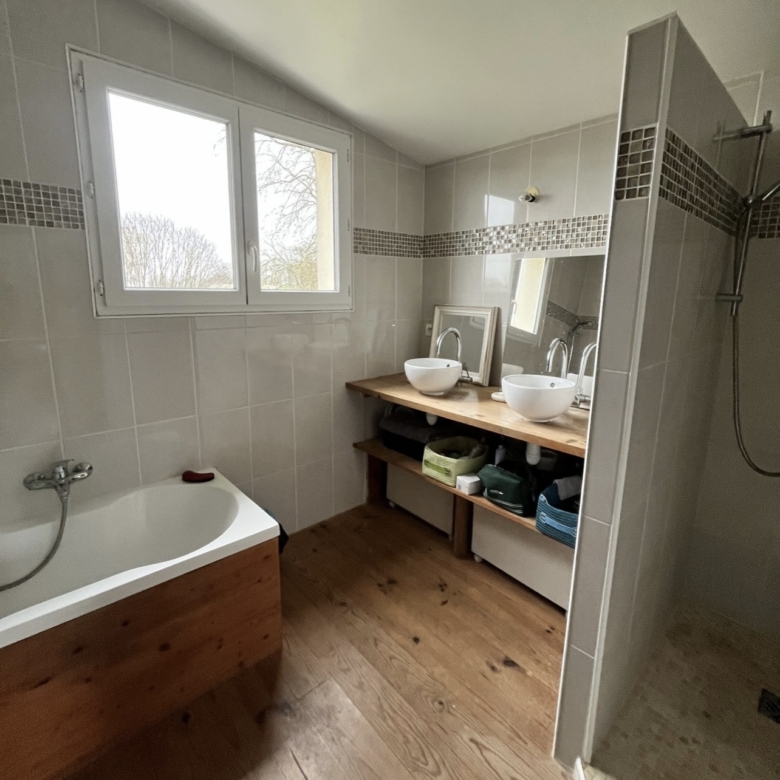À l’étage, un palier dessert un petit dressing, trois belles chambres avec rangements, une grande salle de bains avec douche et baignoire, ainsi qu’un WC indépendant.