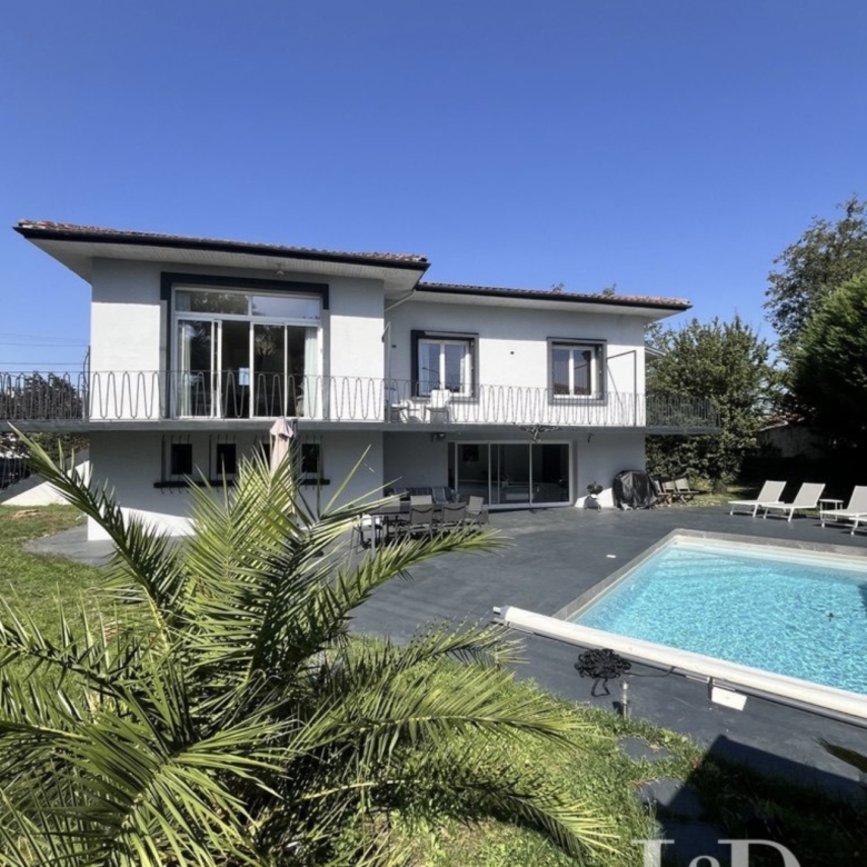A l’étage, une grande pièce de vie avec cheminée ouvre sur une terrasse avec vue plongeante sur la piscine. Vous découvrirez aussi une cuisine indépendante, 3 belles chambres avec rangements, une salle d’eau et un wc séparé.