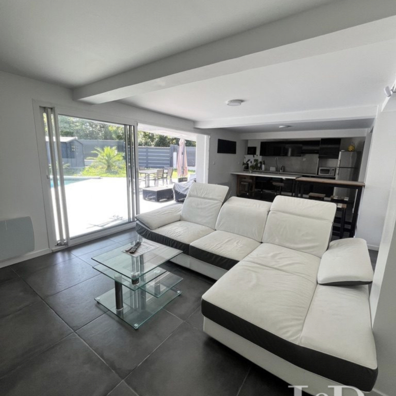 Au rez-de-chaussée, un vaste séjour lumineux de près de 60m² est ouvert sur une cuisine américaine équipée moderne, idéale pour les repas en famille ou entre amis. Une grande baie vitrée ouvre directement sur la terrasse et la grande piscine chauffée ainsi que le spa.