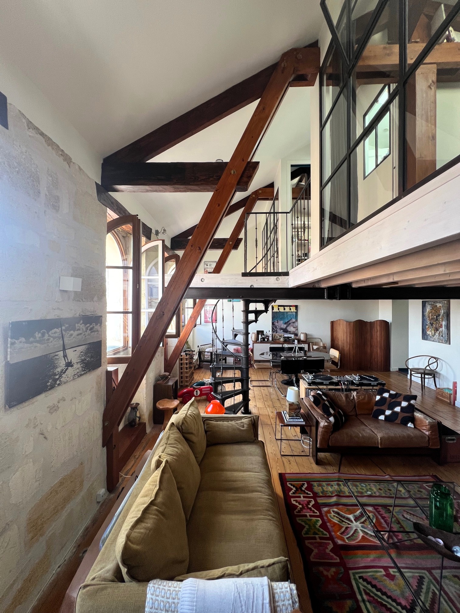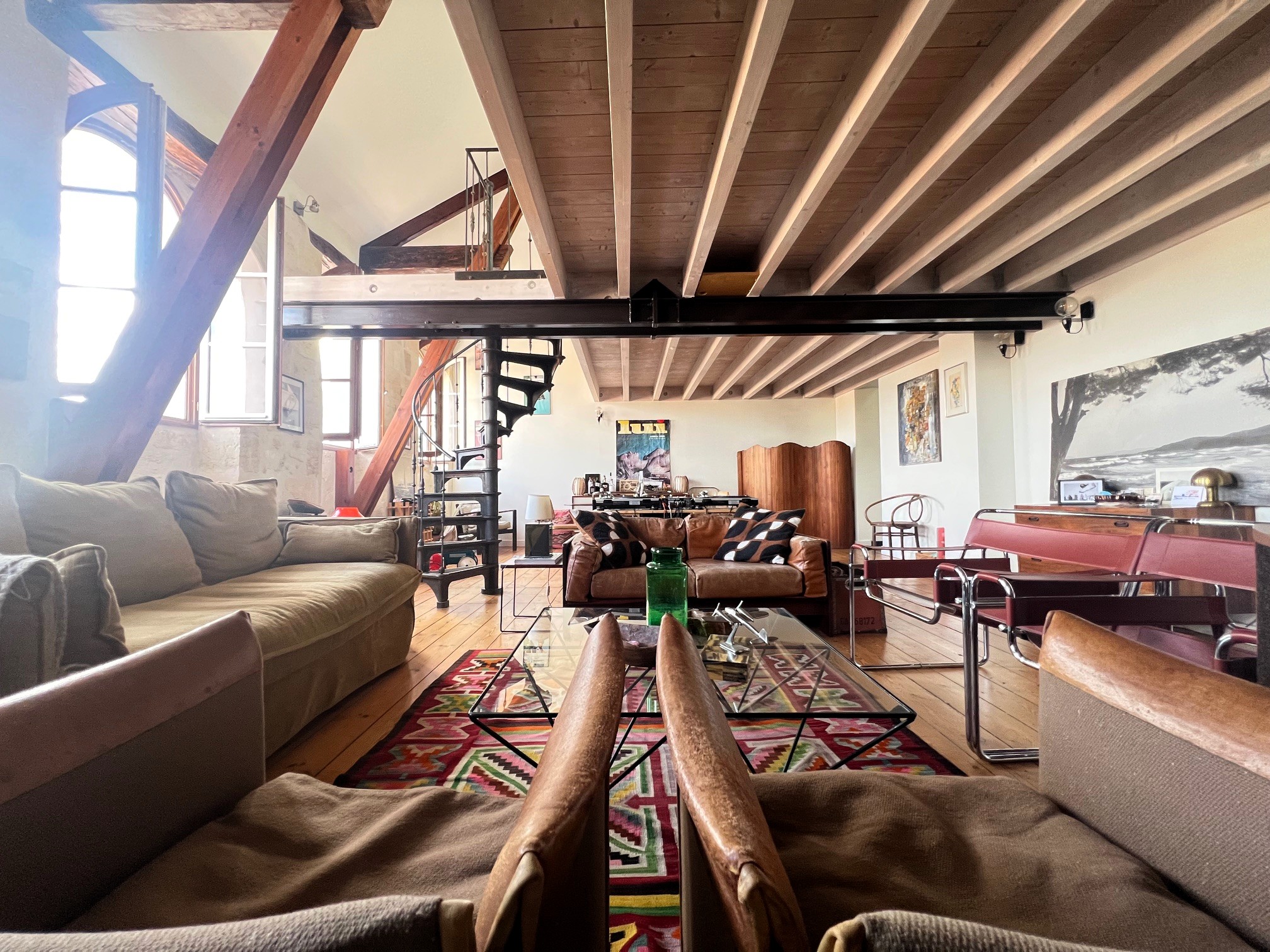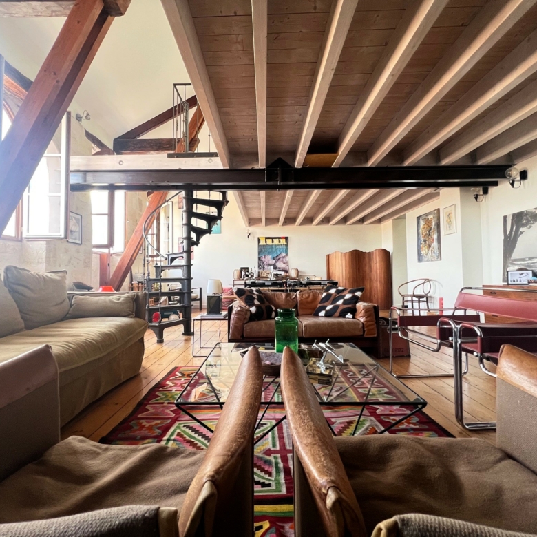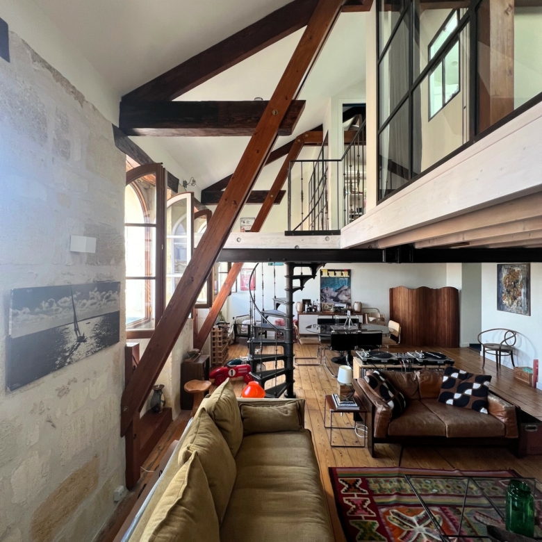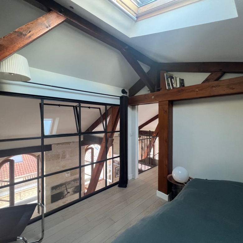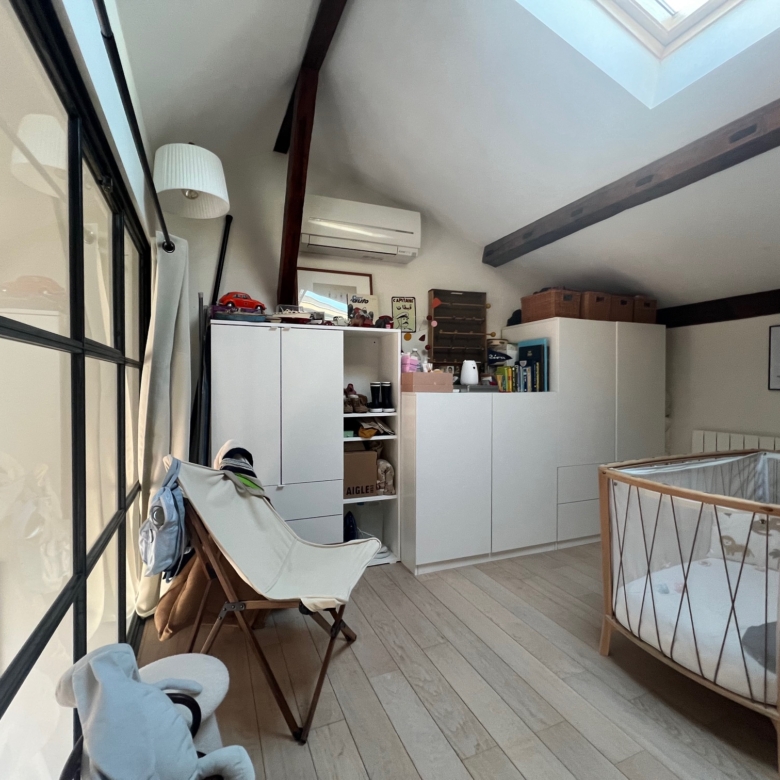 Nichée au 3éme et dernier étage d’un élégant immeuble en pierre, la vaste pièce de vie est baignée de lumière grâce à ses quatre grandes fenêtres et offre un cadre chaleureux et convivial.