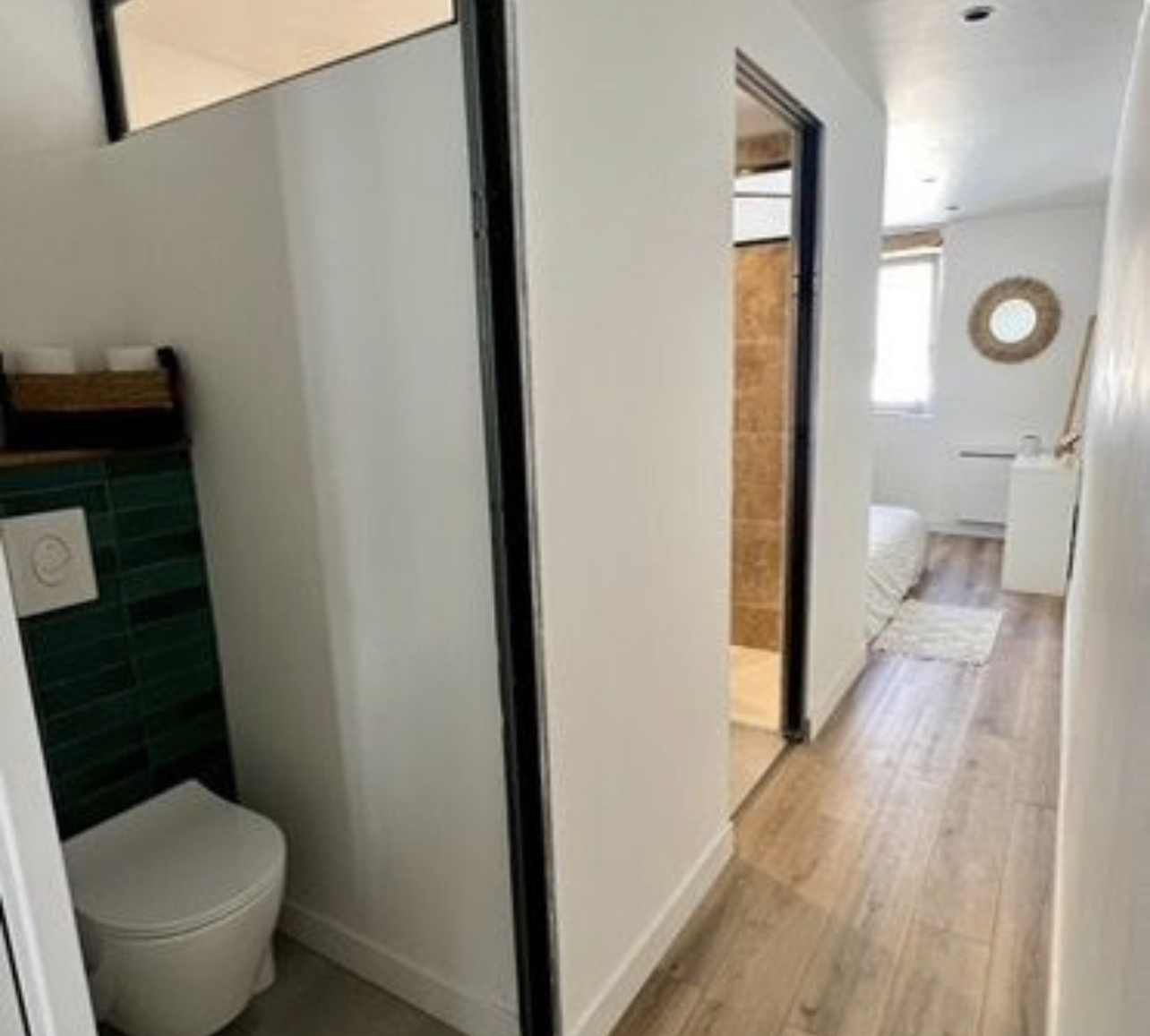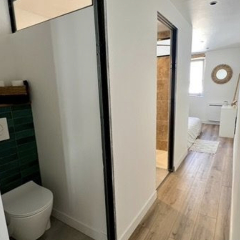 Un couloir dessert l’espace nuit composée d’une chambre lumineuse, une salle d’eau avec douche à l’italienne et rangement pour machine à laver ainsi qu’un WC séparé.