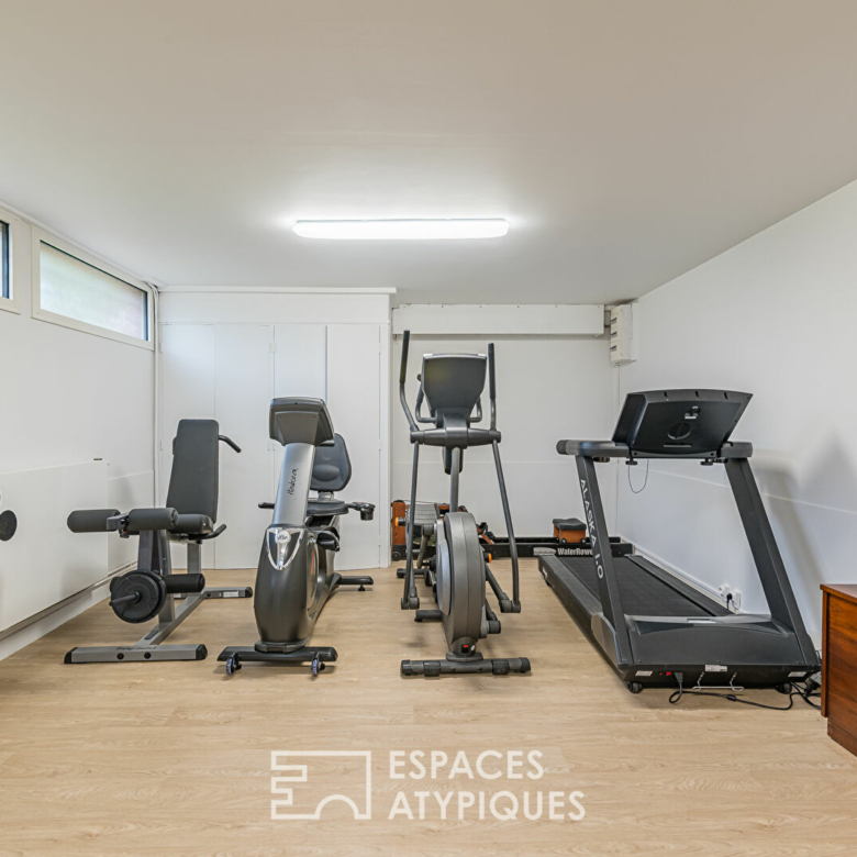 Le sous-sol renforce l’esprit familial de la maison en offrant de véritables espaces de partage et de détente, avec une salle de cinéma pour des soirées conviviales et une salle de sport pour répondre aux besoins de toute la famille.