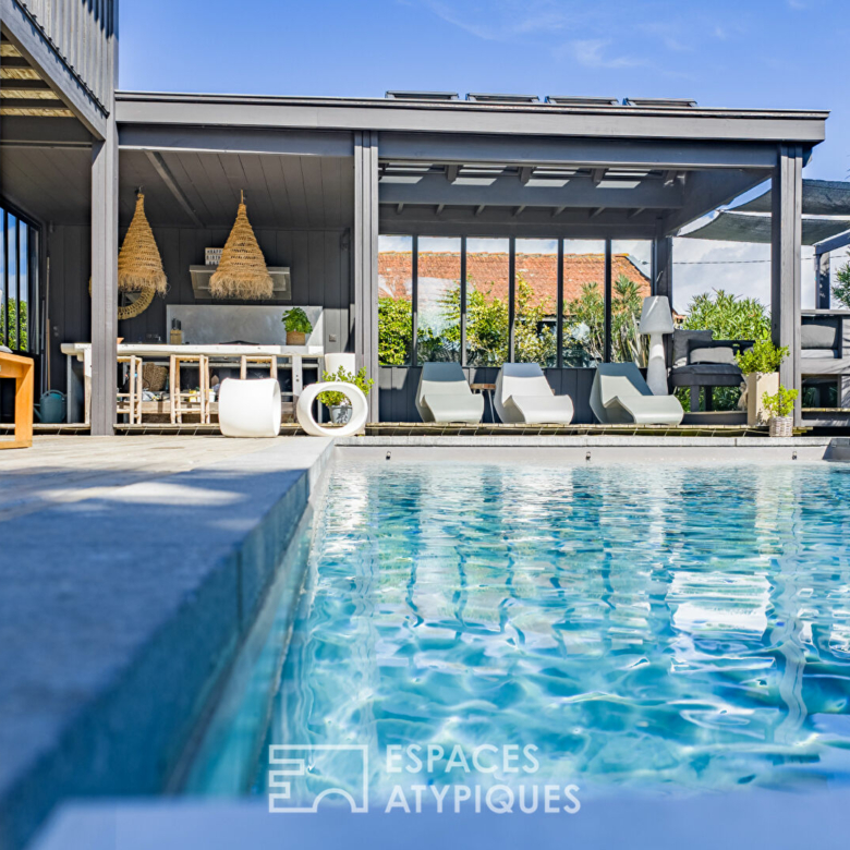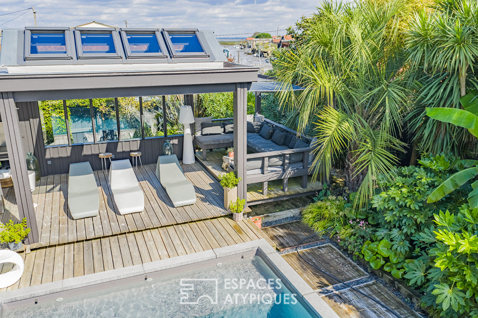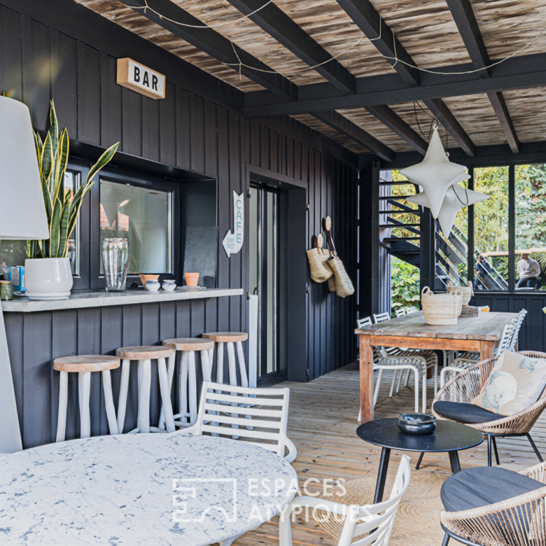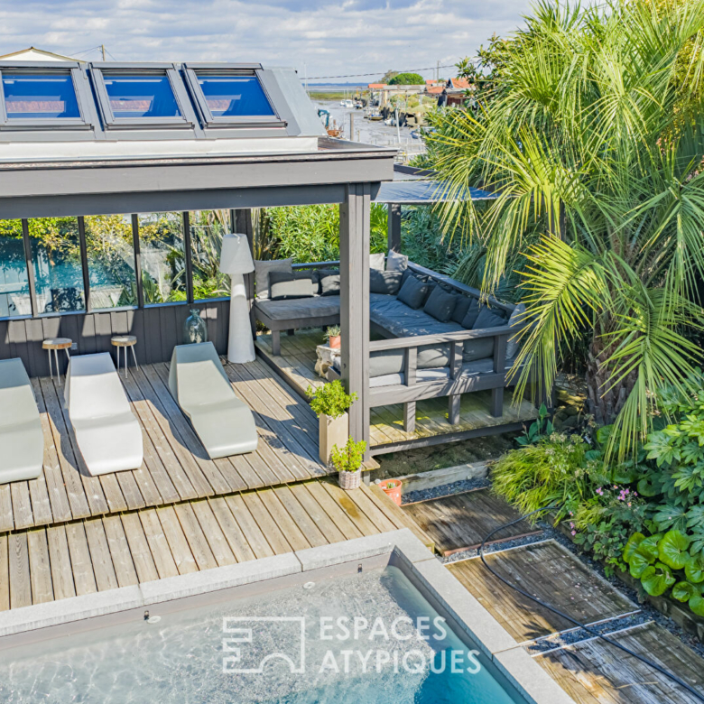 Redessinée en 2022 par Mathieu Villemonteil, cette demeure de 224 m² habitables, toute de bois vêtue, célèbre avec élégance le style local. Inspirée des cabanes ostréicoles emblématiques du Bassin d’Arcachon, elle s’inscrit avec une justesse absolue au coeur du port authentique de Meyran.