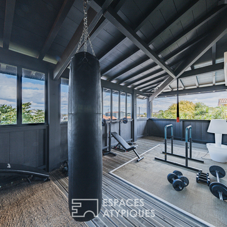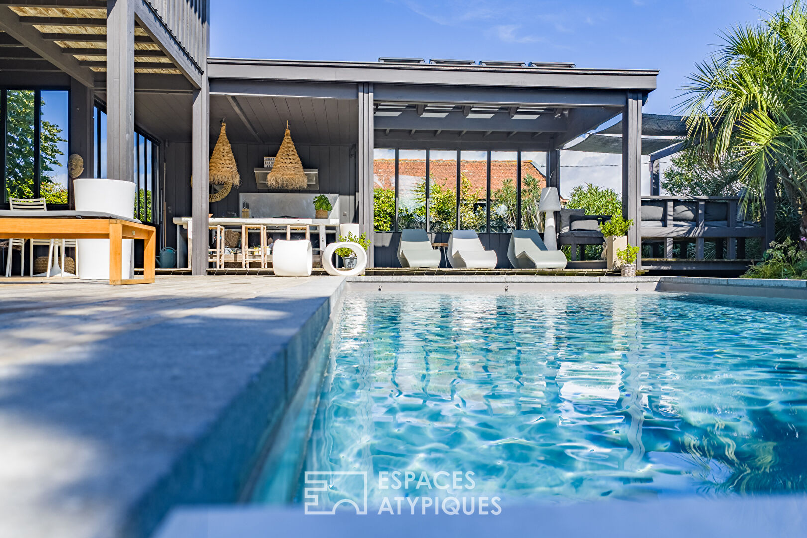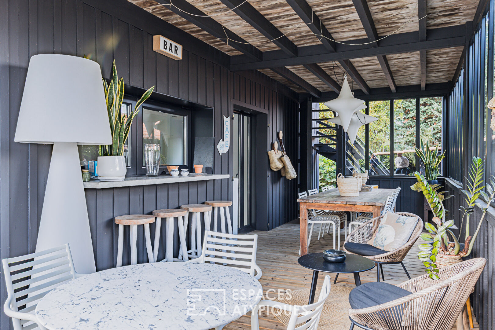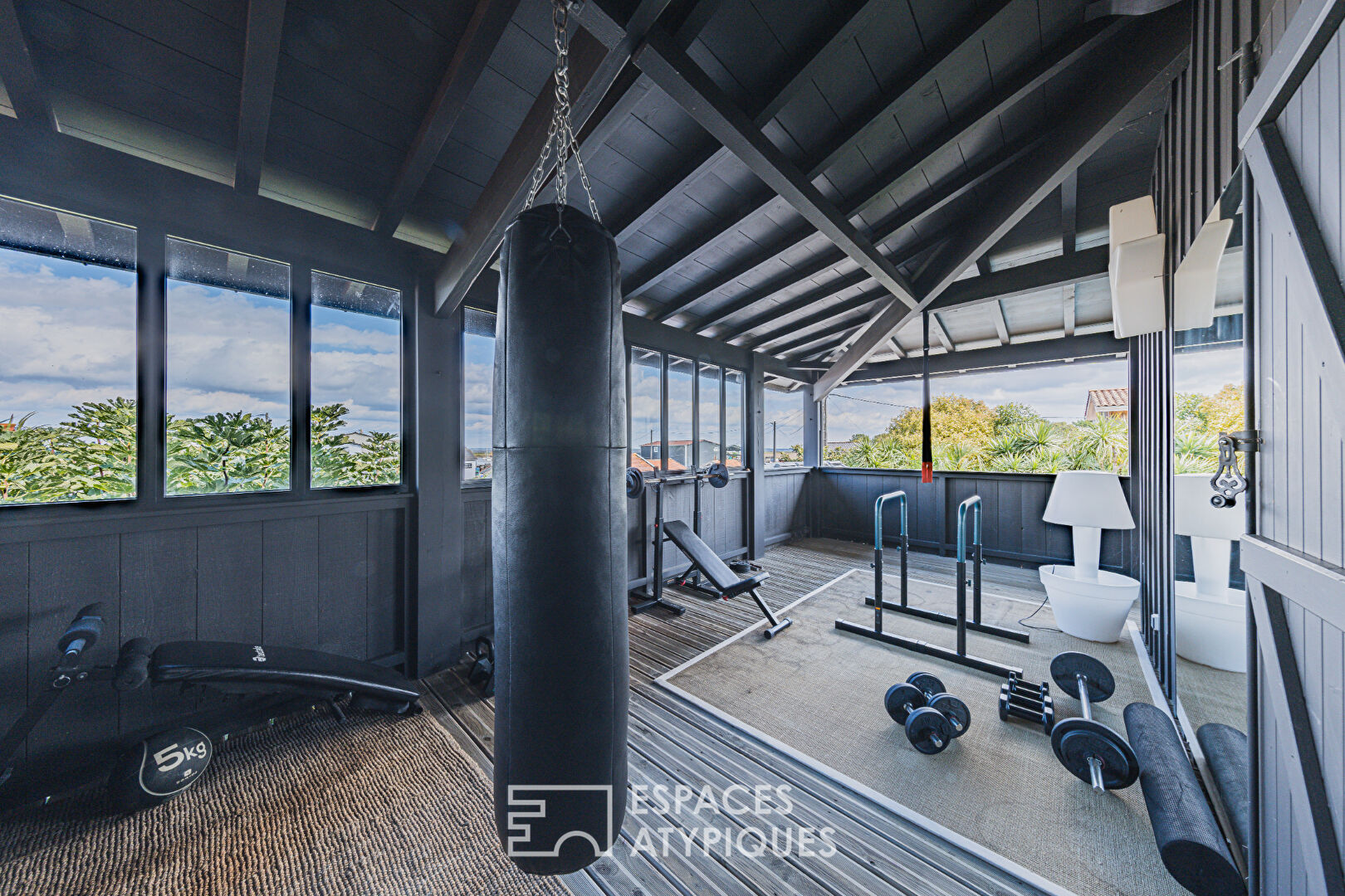 Redessinée en 2022 par Mathieu Villemonteil, cette demeure de 224 m² habitables, toute de bois vêtue, célèbre avec élégance le style local. Inspirée des cabanes ostréicoles emblématiques du Bassin d’Arcachon, elle s’inscrit avec une justesse absolue au coeur du port authentique de Meyran.