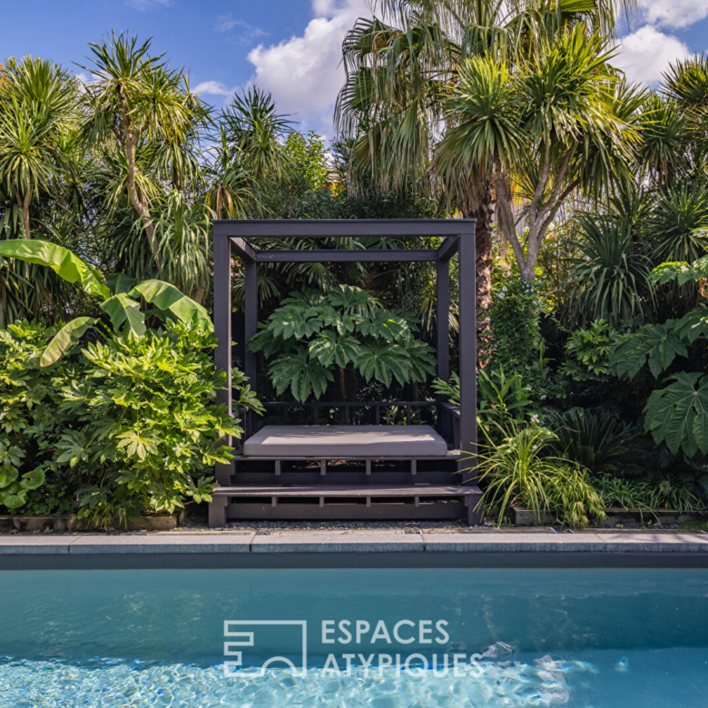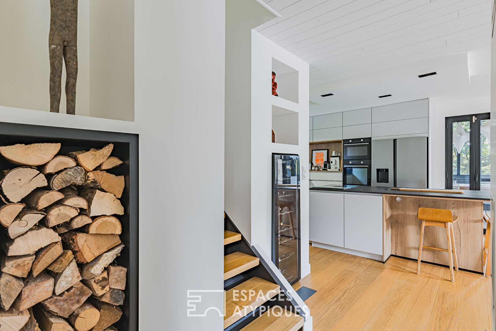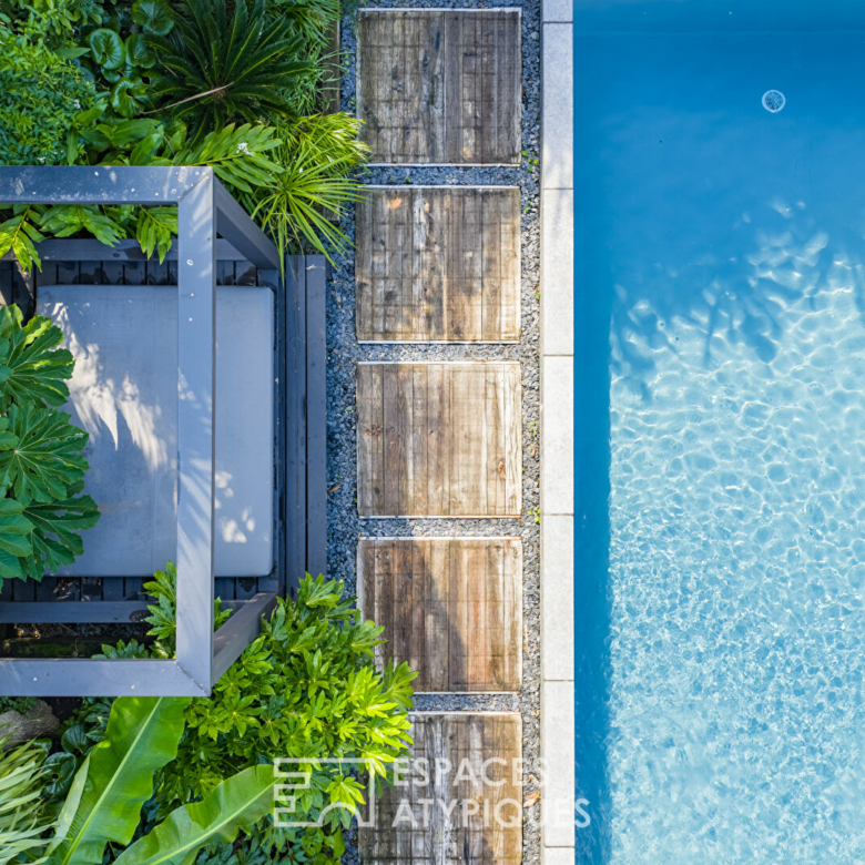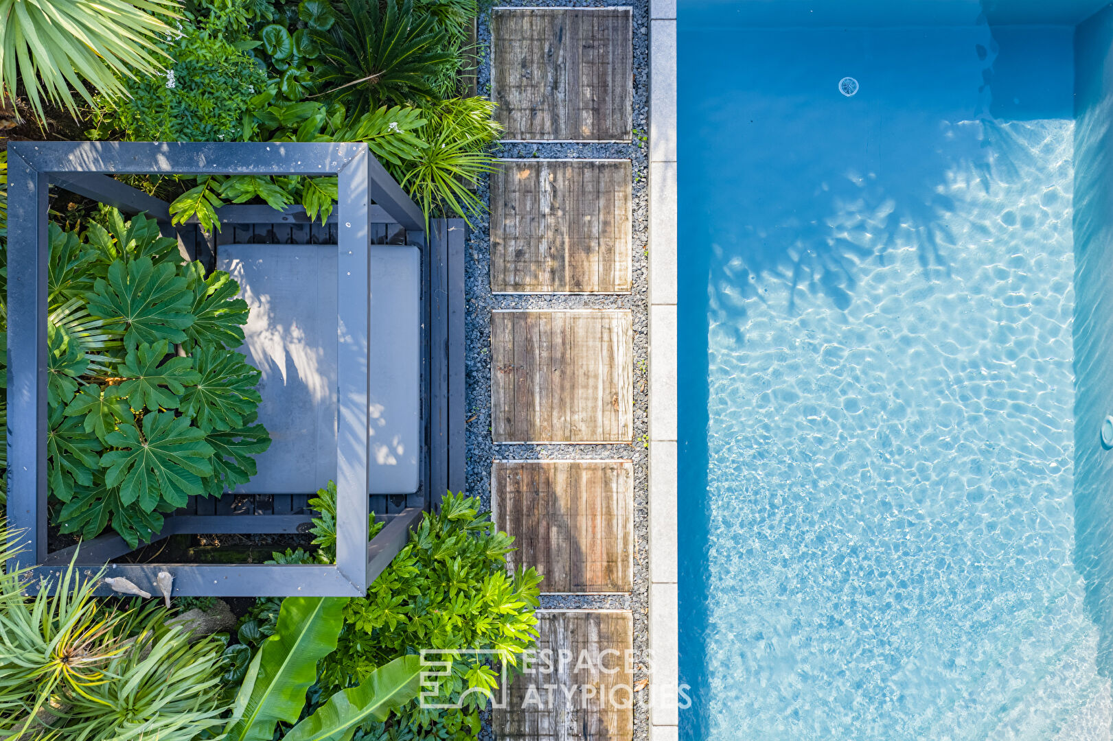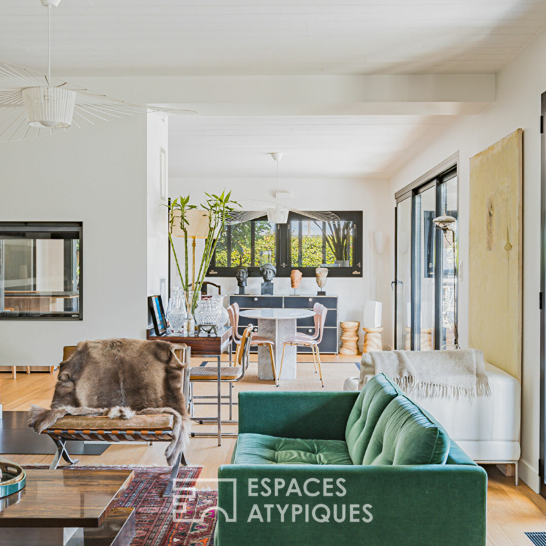 Baignés de lumière grâce à de larges ouvertures, les espaces intérieurs dialoguent avec le luxuriant jardin dans une harmonie remarquable.