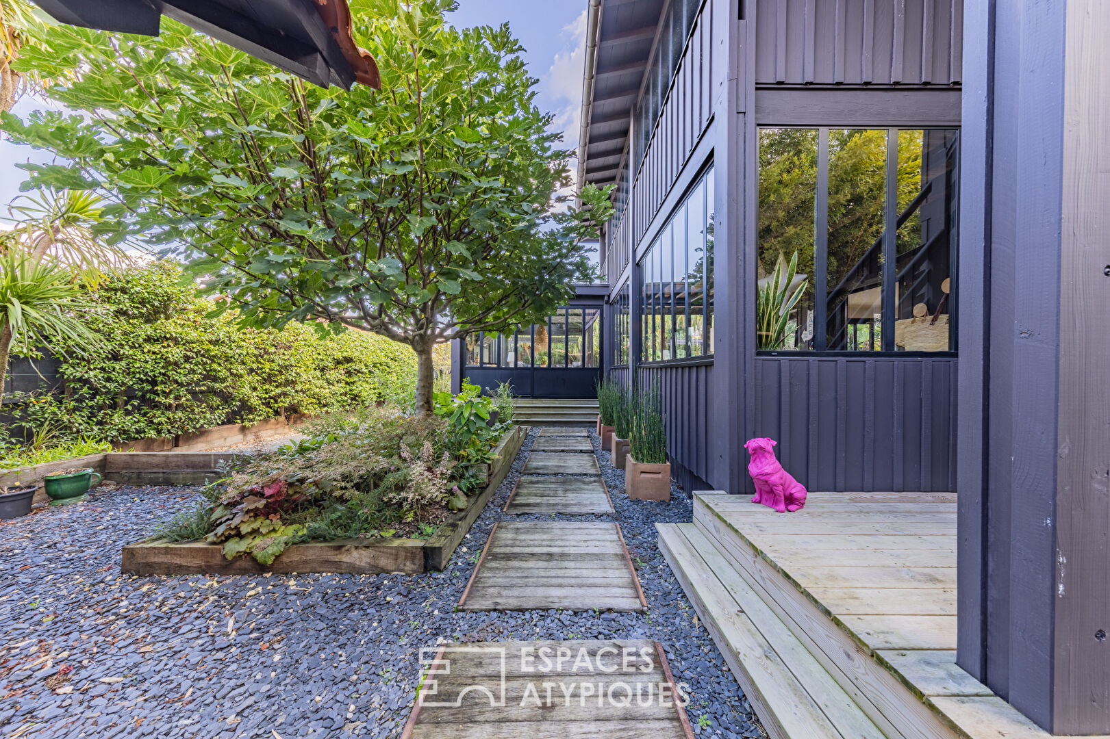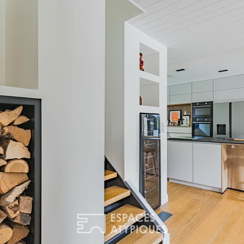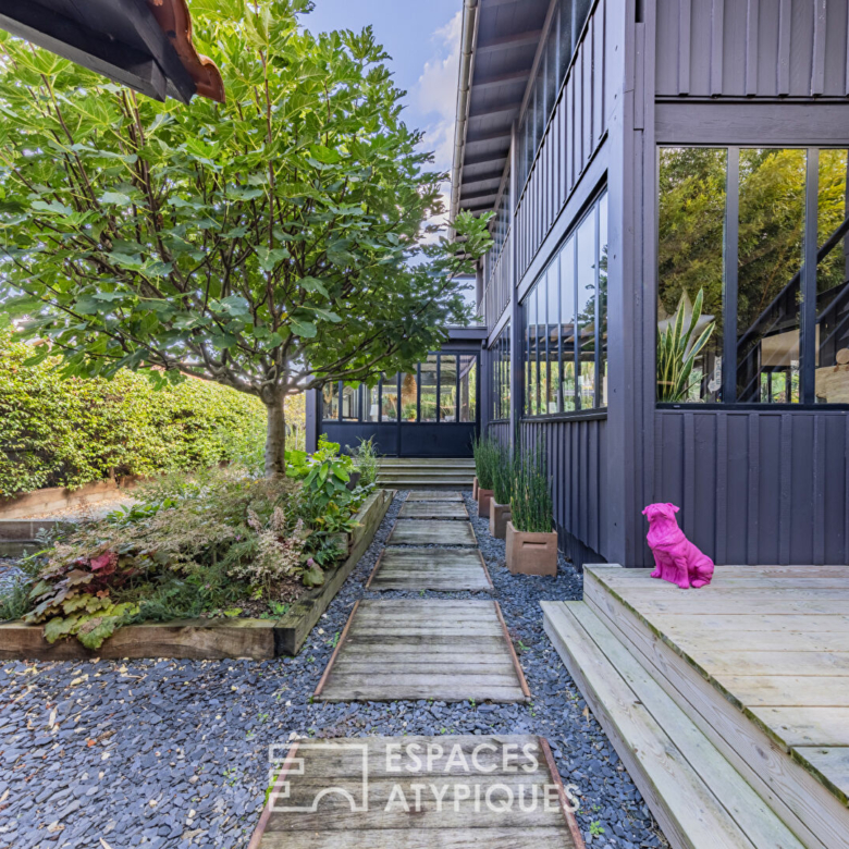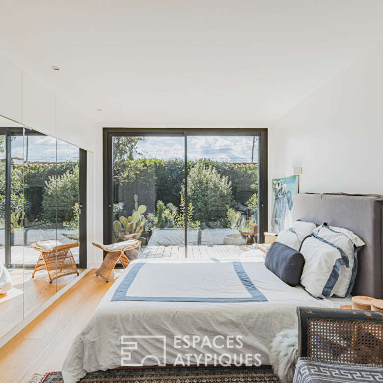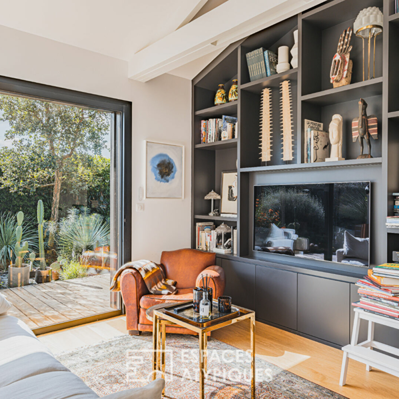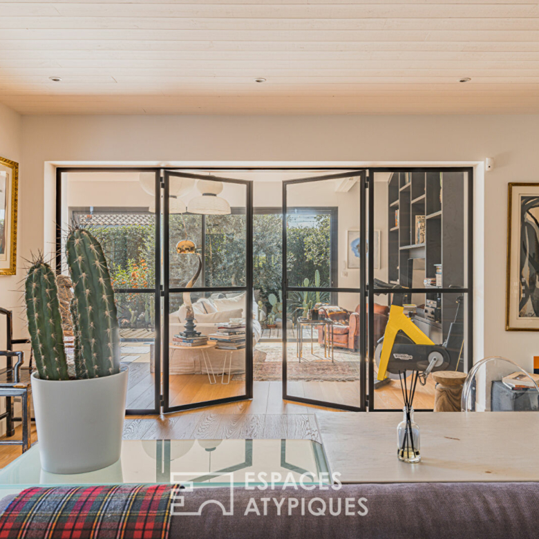 Baignés de lumière grâce à de larges ouvertures, les espaces intérieurs dialoguent avec le luxuriant jardin dans une harmonie remarquable.