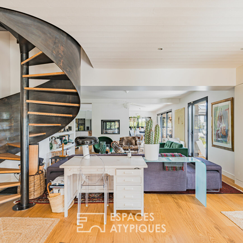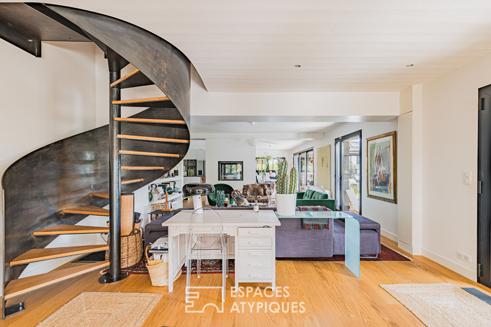 À l’étage, quatre suites aux volumes généreux s’ouvrent sur la coursive et la terrasse, offrant des vues privilégiées sur le port et le bassin. Une cinquième suite indépendante est accessible par un spectaculaire escalier ruban en acier, emblématique du parti-pris architectural de la demeure.