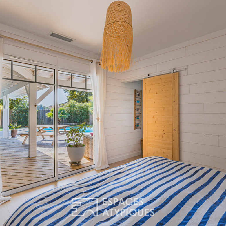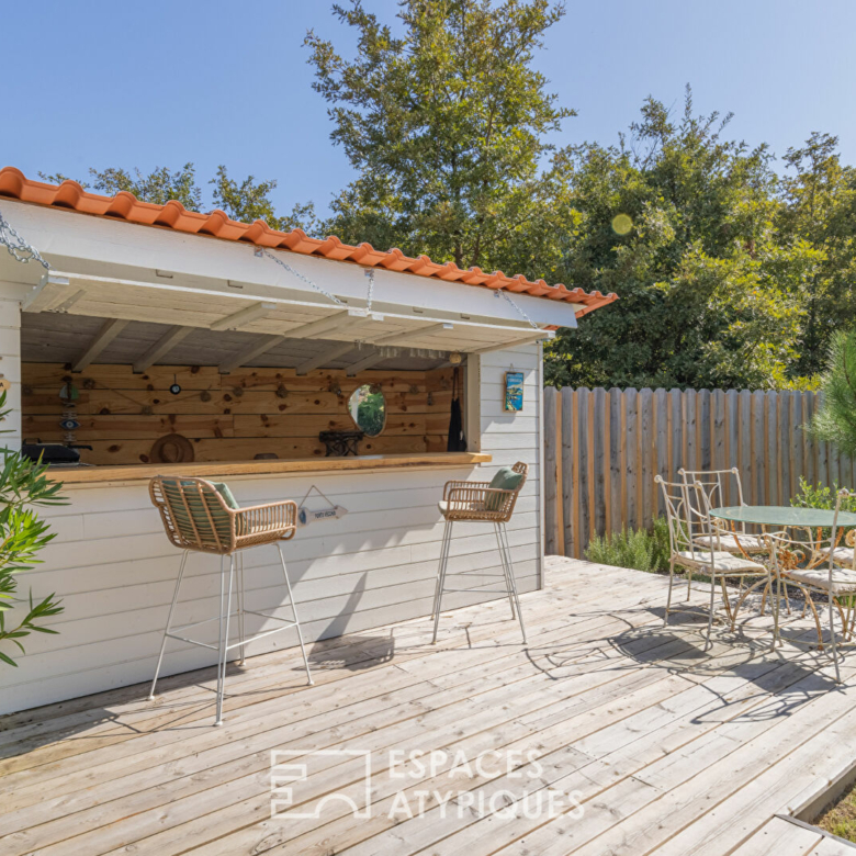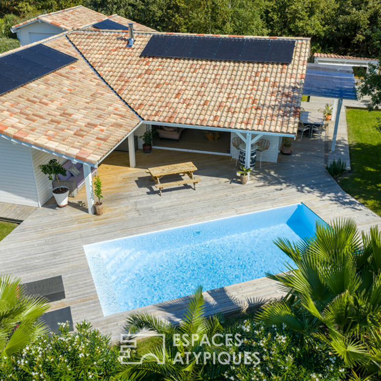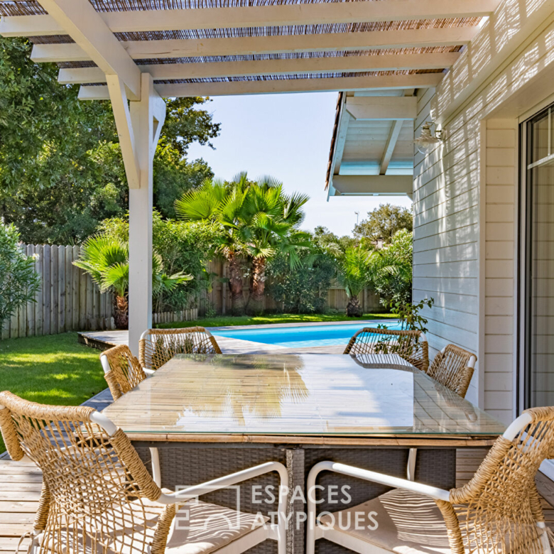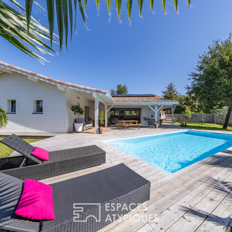 A l’extérieur, une grande et belle terrasse en bois enveloppe la piscine chauffée traitée au sel et une cuisine d’été façon paillote idéal pour profiter des beaux jours. Un garage fermé de 30 m², un local technique et un jardin soigneusement paysagé complètent ce bien d’exception.