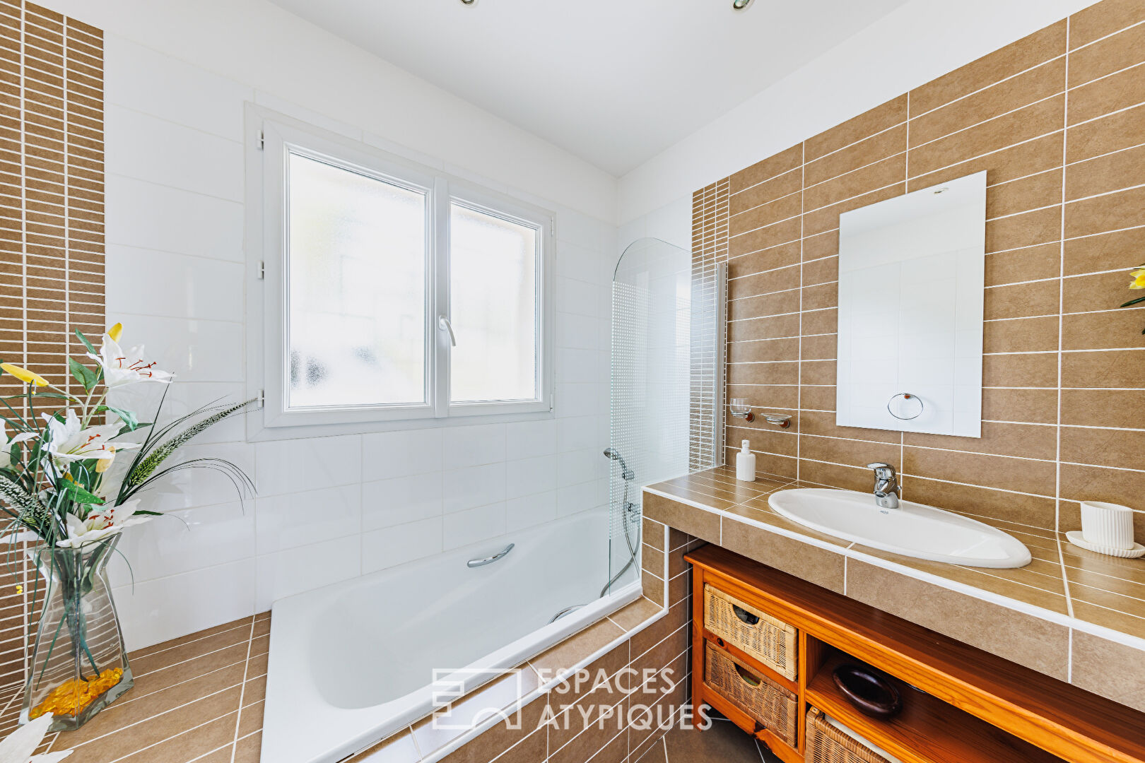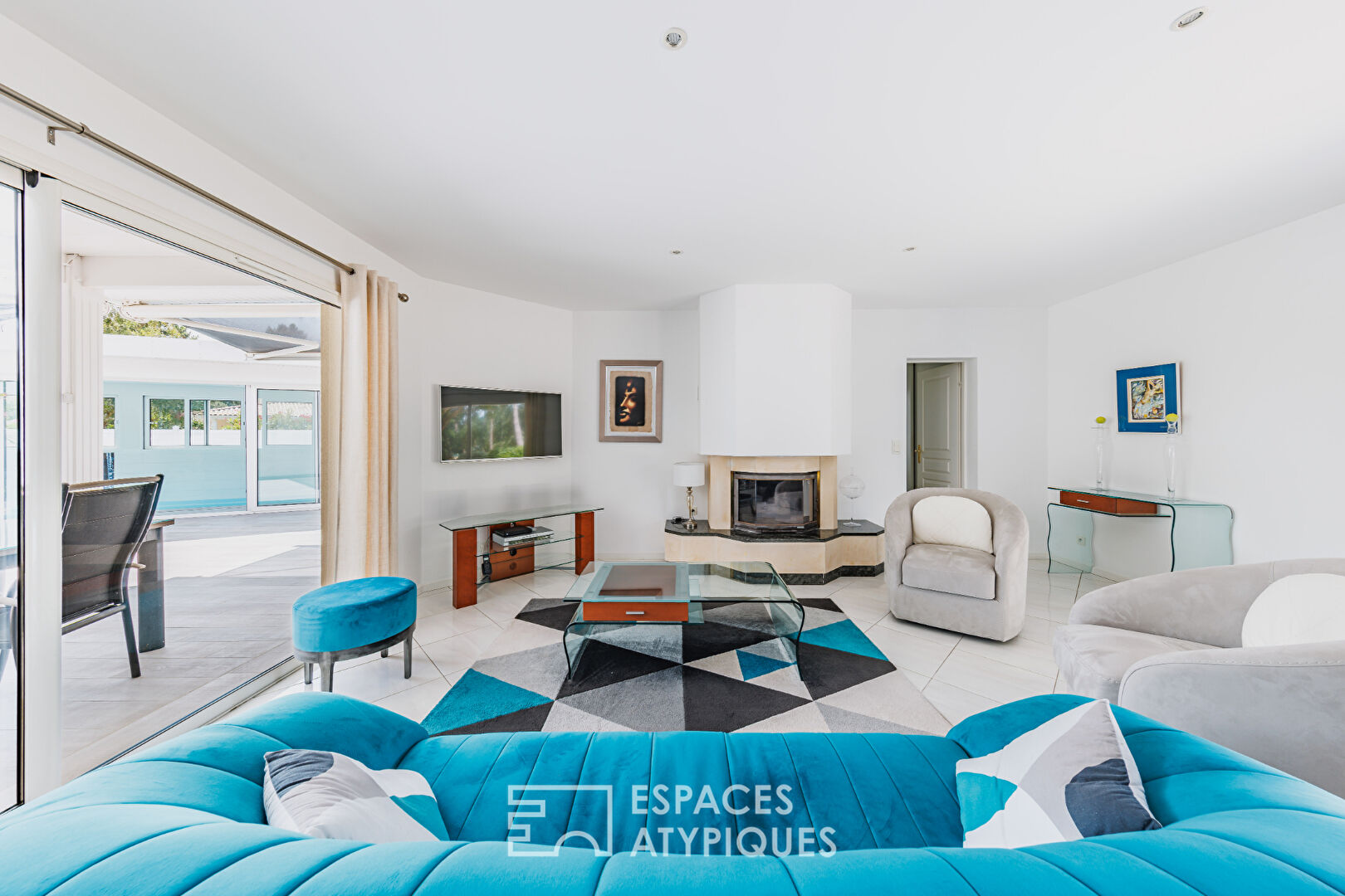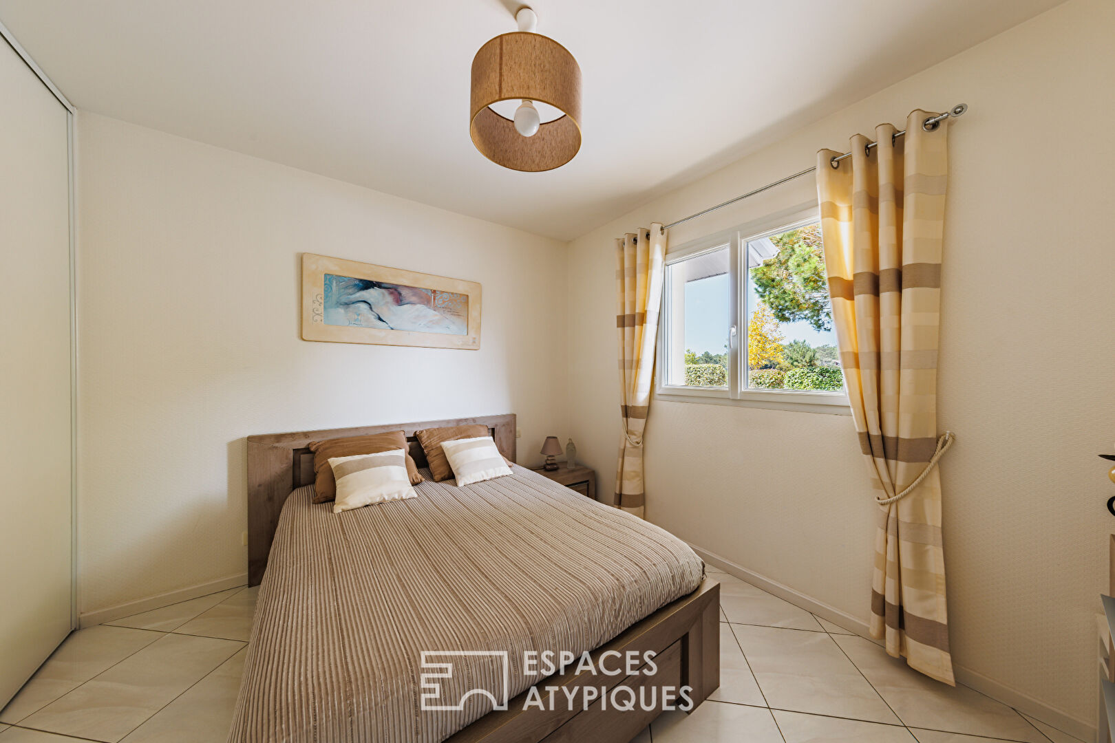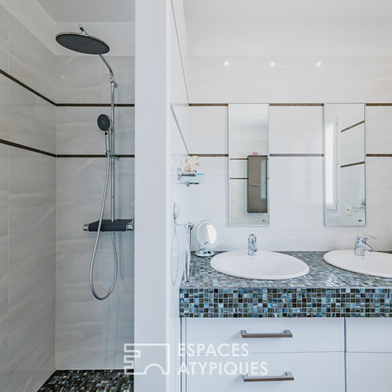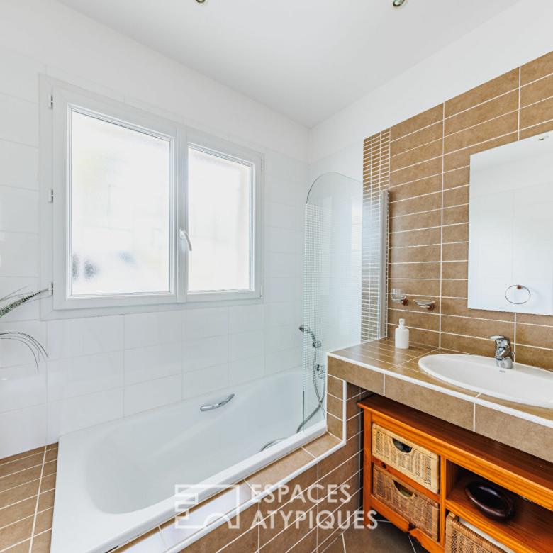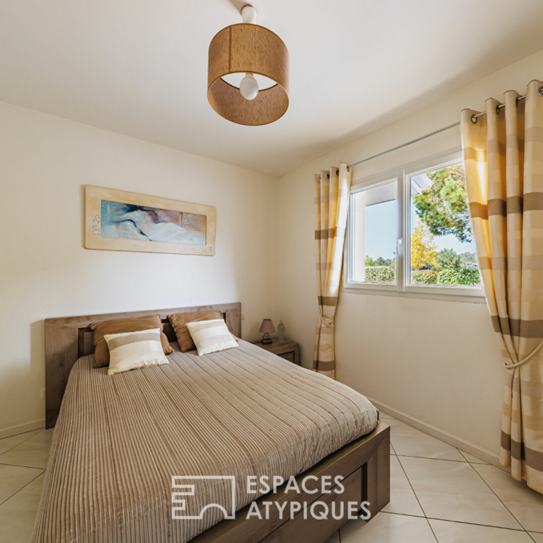L’espace de vie principal séduit par son séjour traversant aux proportions généreuses, sublimé par de grandes baies vitrées ouvrant sur deux terrasses paysagées, dont une partiellement couverte. La cheminée à insert ajoute chaleur et convivialité aux soirées d’hiver, complétant un chauffage au sol performant.