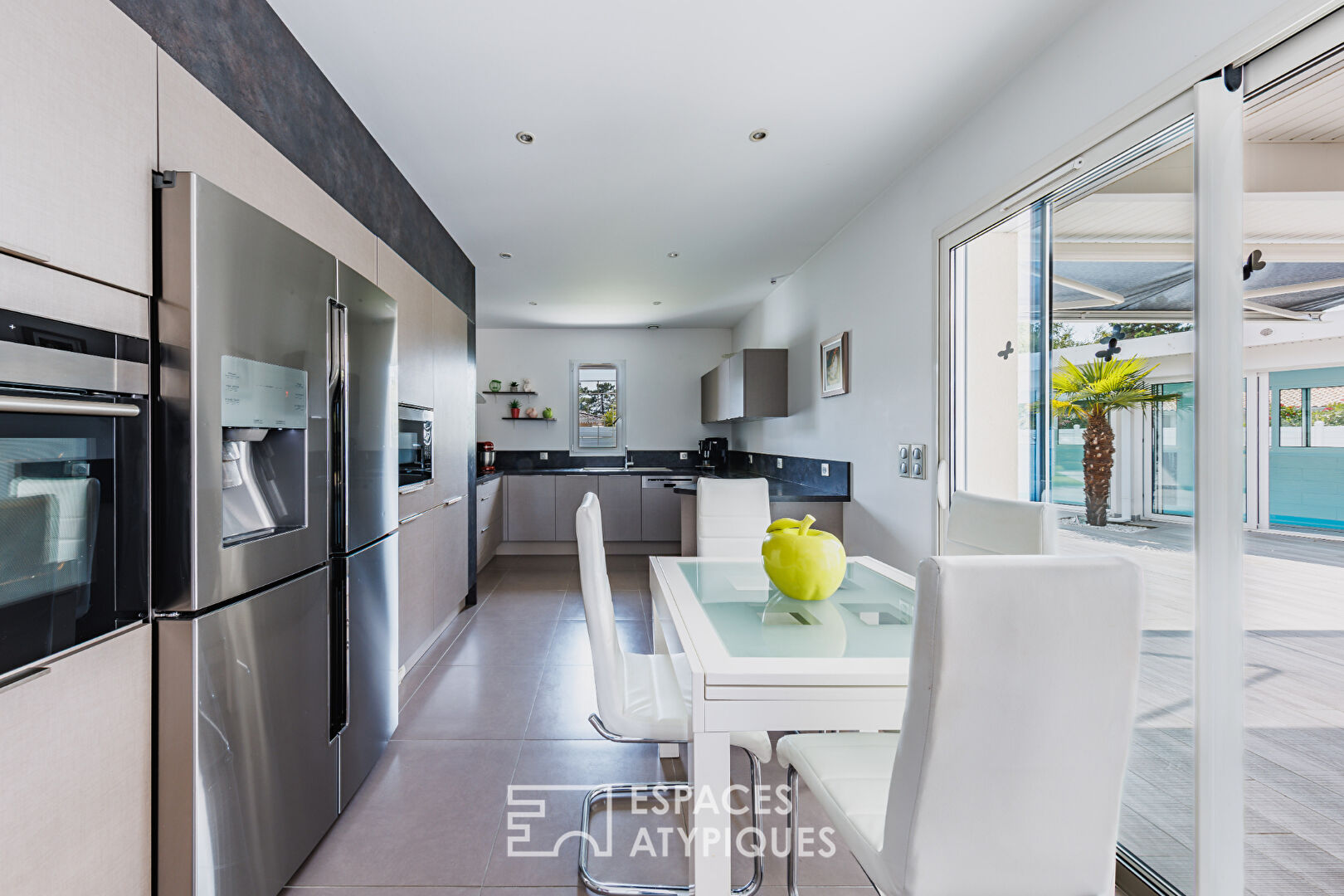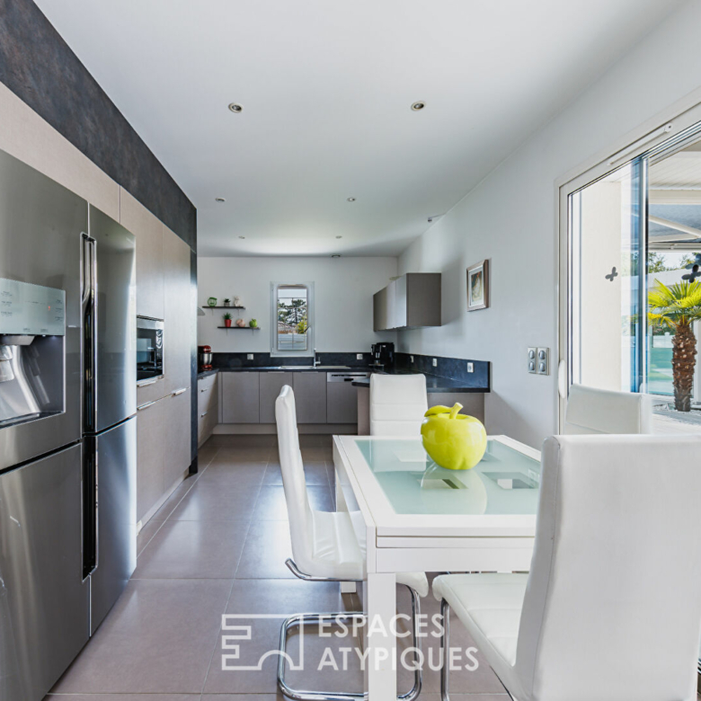 La cuisine, semi-ouverte et fonctionnelle, s’ouvre également sur la terrasse, idéale pour prolonger les moments de convivialité en extérieur, été comme hiver.