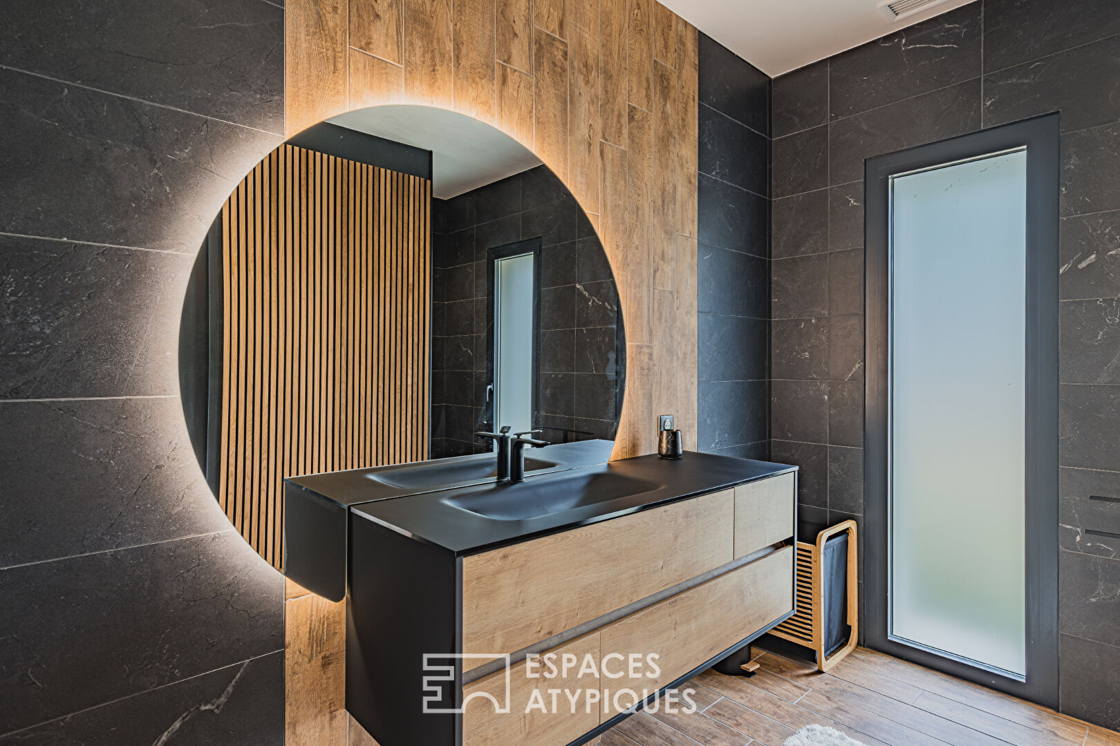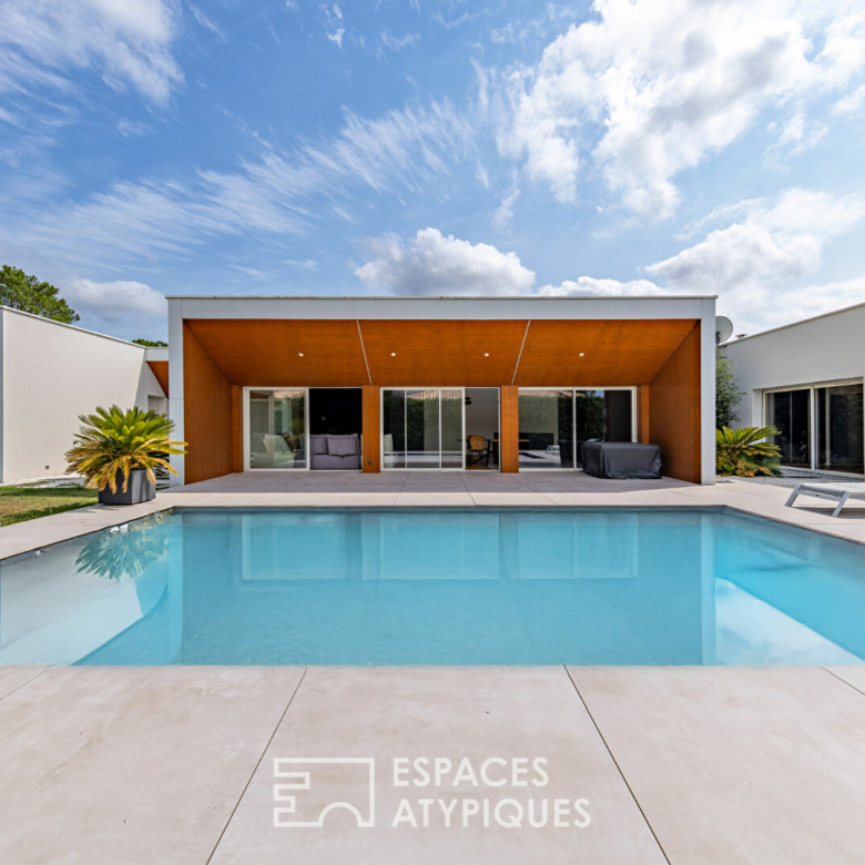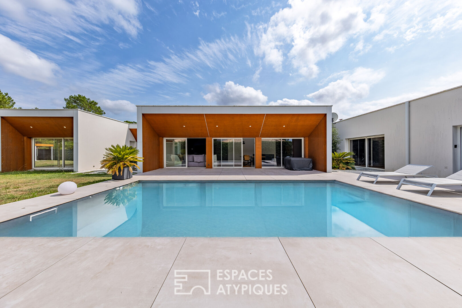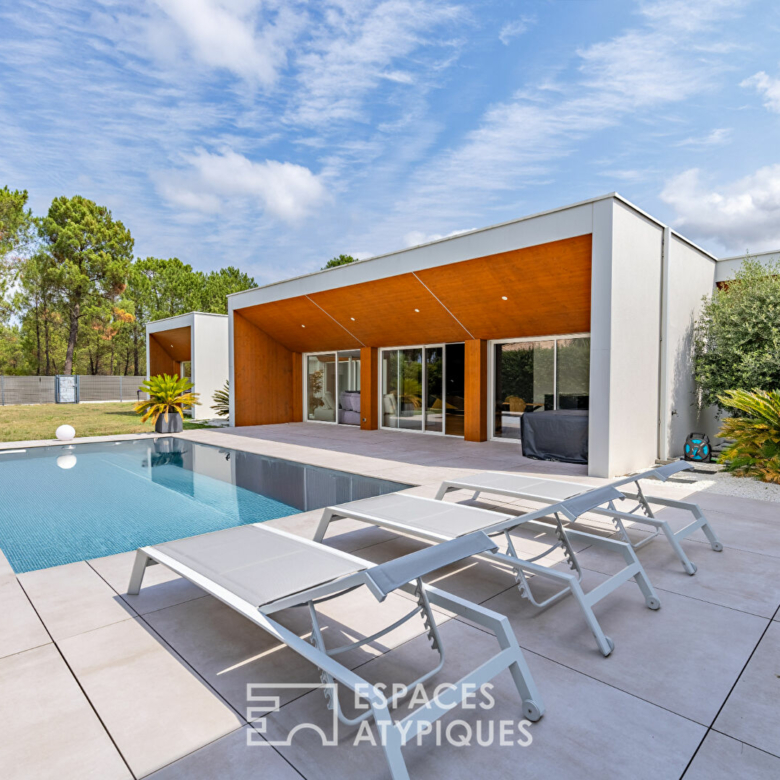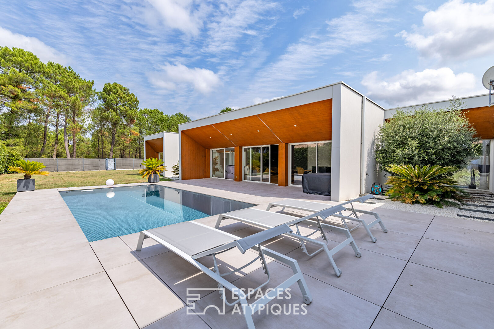 À l’extérieur, la terrasse carrelée encadre la piscine et invite à la détente. Le jardin, en lisière de forêt, préserve l’intimité des lieux et offre une vue dégagée sur un environnement naturel et arboré.