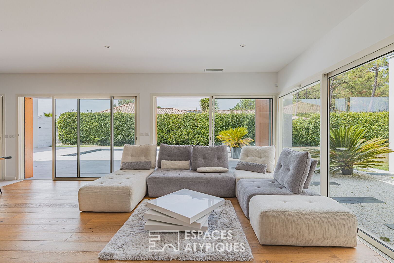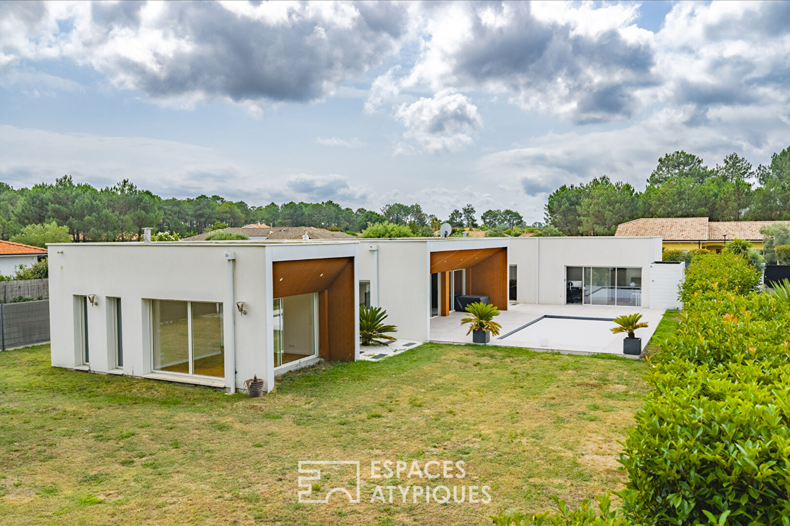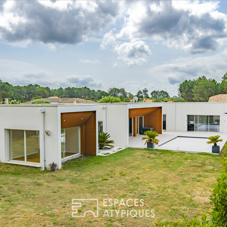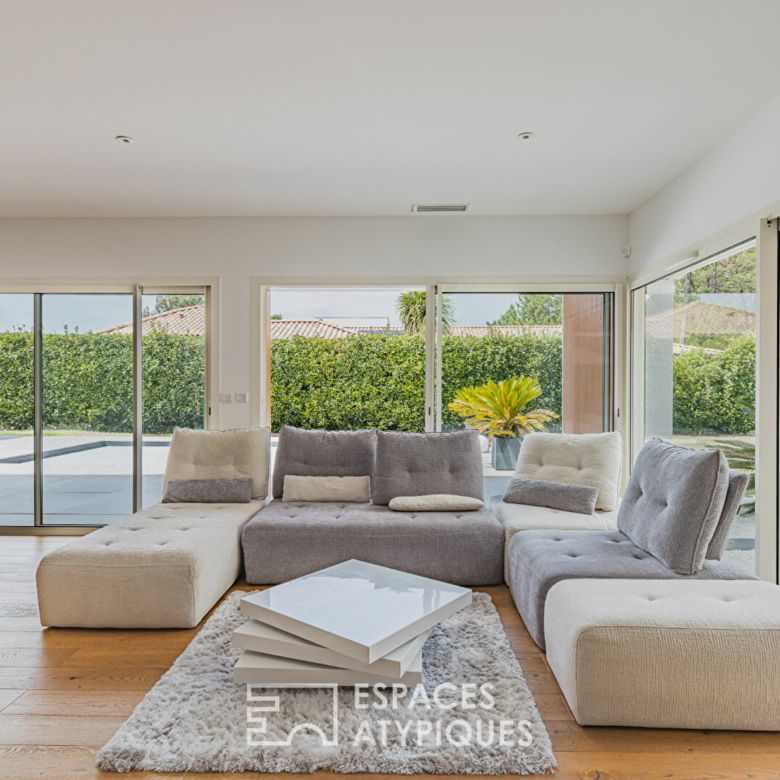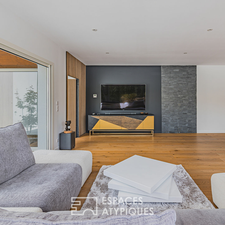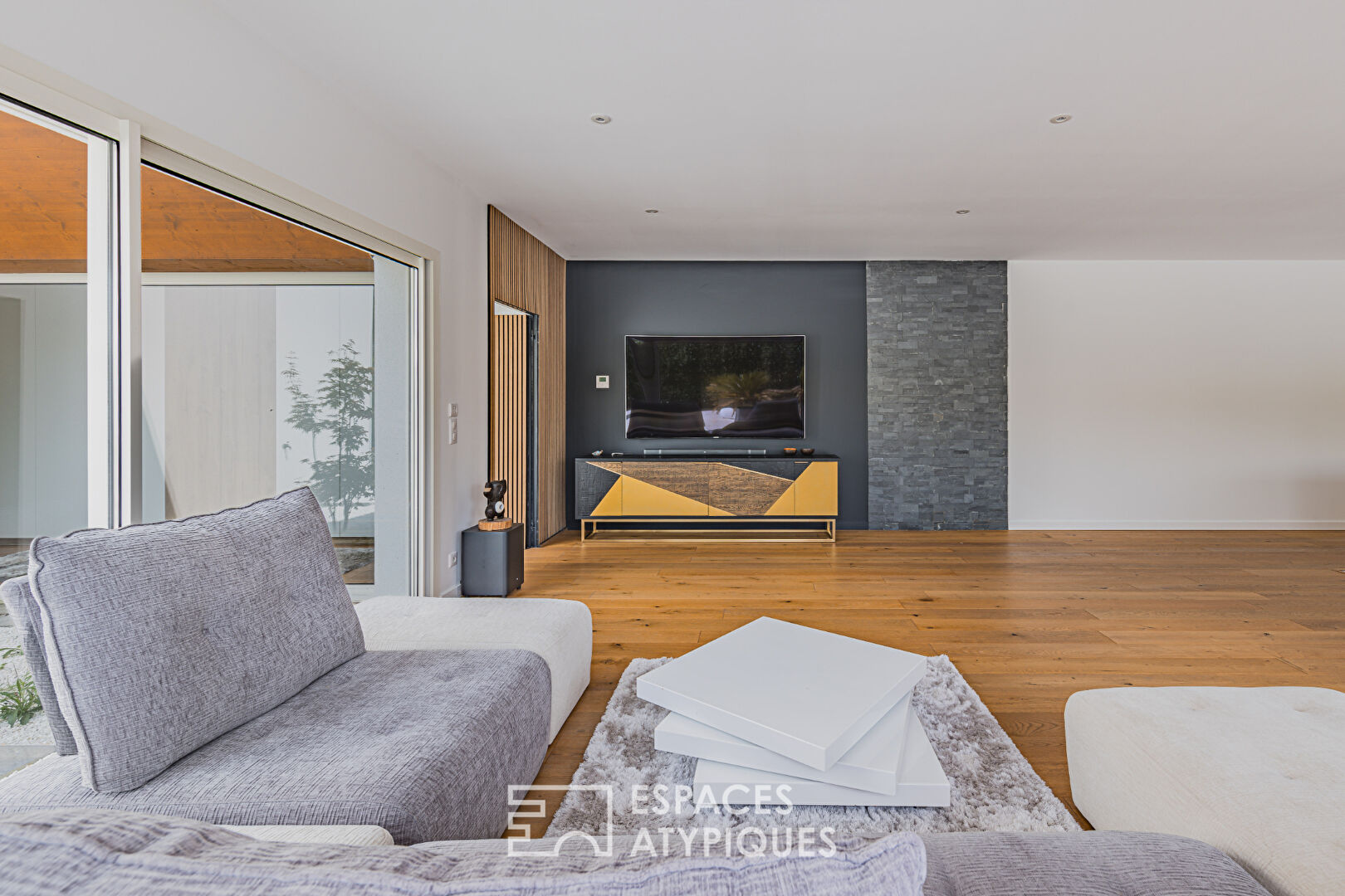 L’architecture en toits plats, les finitions soignées et le choix des matériaux confèrent à l’ensemble un cachet résolument contemporain. L’organisation des espaces permet une réelle fluidité dans la circulation et une séparation efficace entre les espaces jour et nuit.