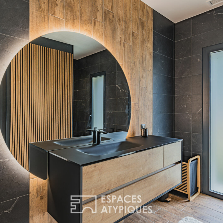 L’espace nuit se compose de trois chambres, chacune disposant de sa salle d’eau privative, dont une suite parentale avec dressing, ainsi qu’un bureau indépendant.