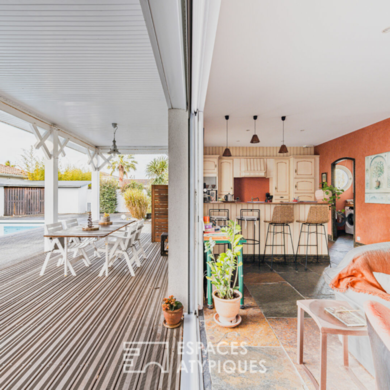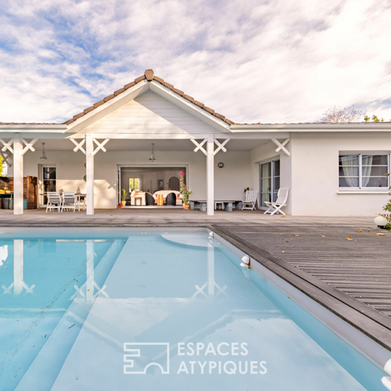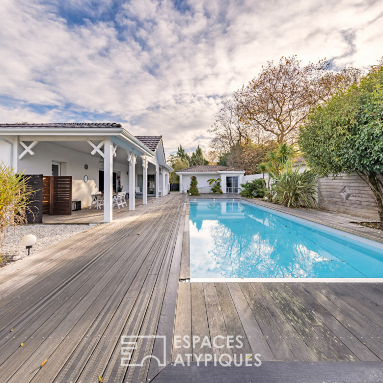 À l’extérieur, la magie opère. Les espaces extérieurs aménagés posent le regard sur une piscine élégante, véritable invitation à la détente, et un jardin clos et paysagé de 825 m² où règnent calme et intimité. Ce havre de verdure permet de profiter pleinement du doux art de vivre du Bassin d’Arcachon.